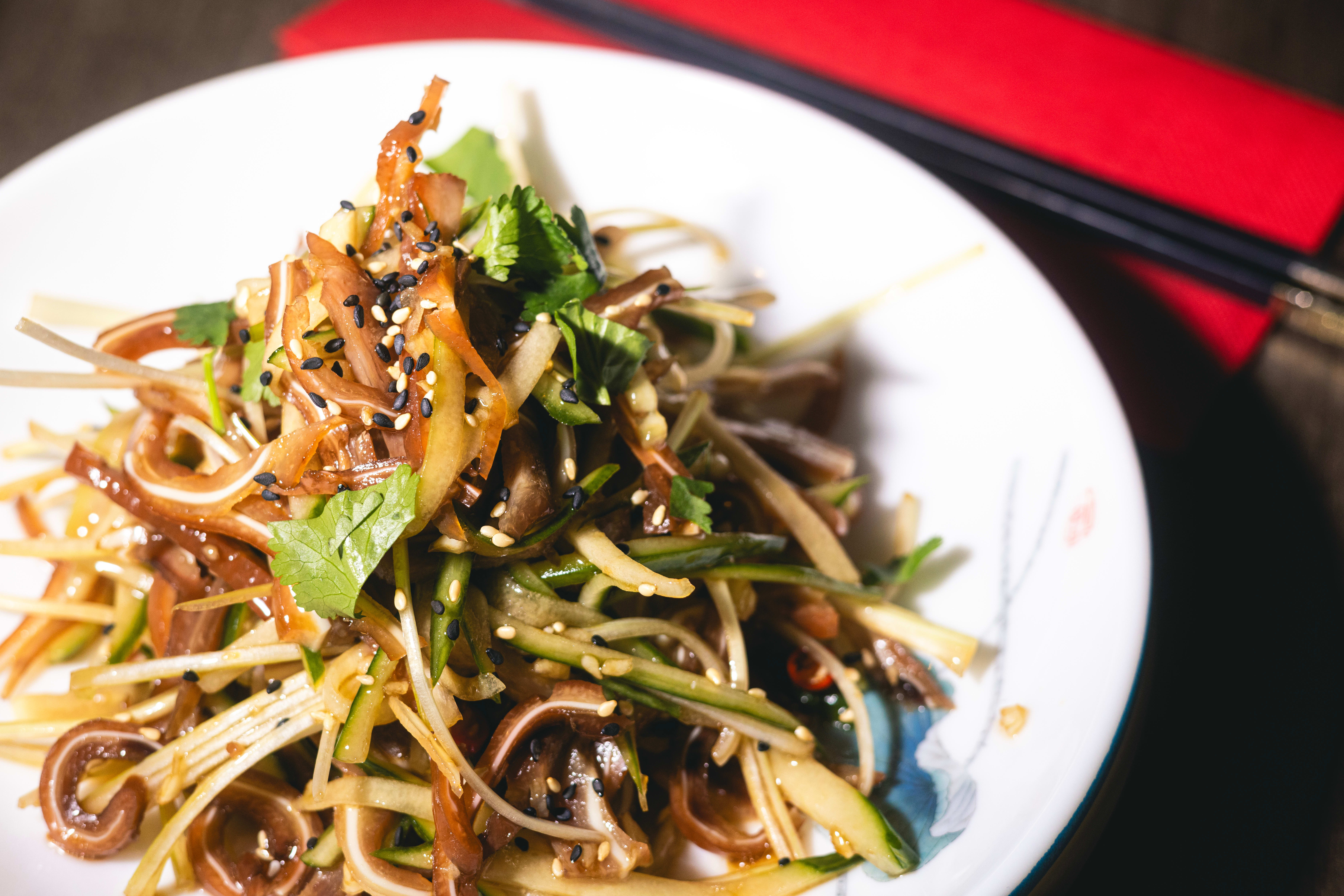 Siden vi faktisk har bestilt fra den hemmelige menyen, føles det som at vi har vunnet allerede. Og det blir raskt hurrastemning – av to salater! Spinatsalat med peanøtter har både dybde og friskhet. Slik kan også kinesisk mat være: rå, lett og enkel.