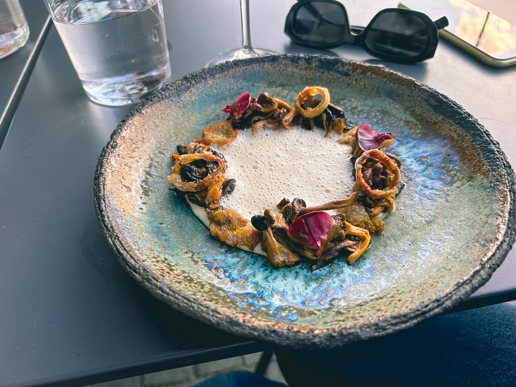 Så traktkantareller i en sirkel. Med fritert løk og kyllingskinn, samt litt blomsterblader, som pakker inn en skummet saus med västerbottenost. Ojojoj for en umamibombe. Og så pen!