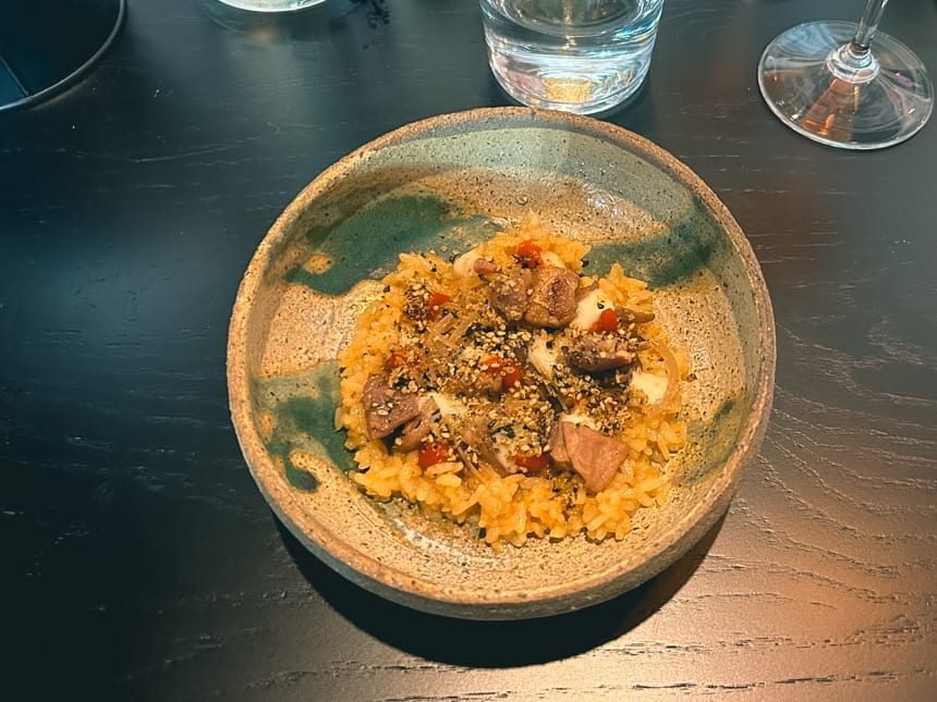 Heldigvis får vi kveldens aller beste rett samtidig. Stekt ris i andefett – en slags hellig gral av asiatisk restemat. Mørt andekjøtt ligger i en seig ris som virkelig bader i fett, mens en frisk hotsauce bryter pent gjennom. Utrolig godt.