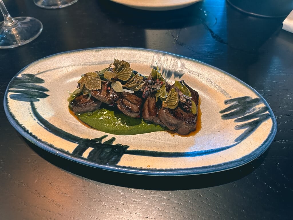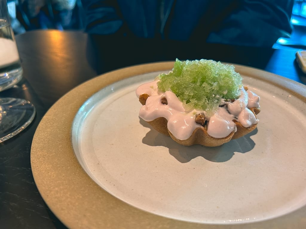 En liten taco med geit, salsa på beinmarg og tomatillos overbeviser oss ikke helt, men er et absolutt deilig tygg. Mildt kjøtt, med søtt, salt og litt kick.