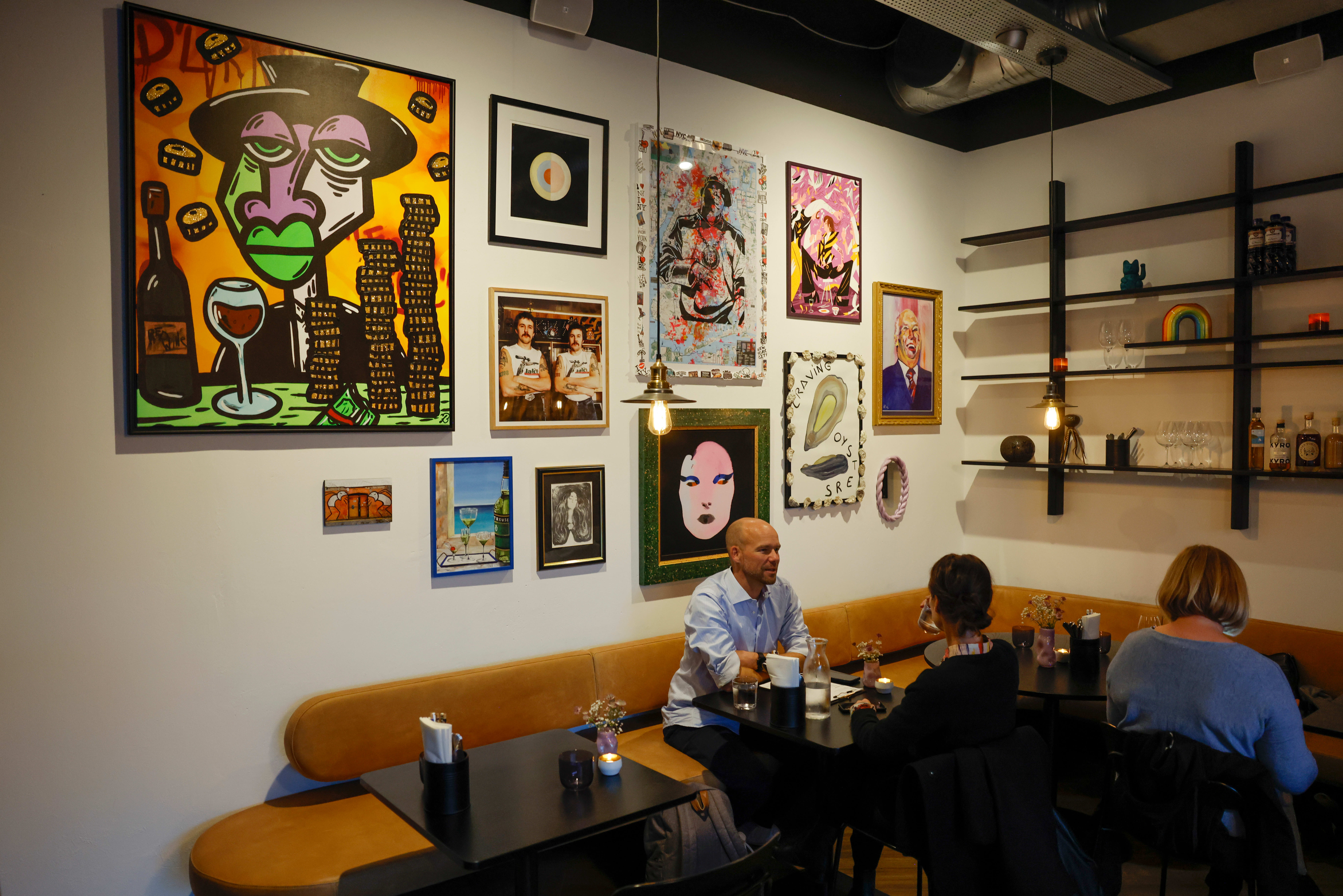 Vi har sagt farvel til solen og fått bord i restauranten. Det er høyt under taket, men det kjennes rotete ut der oppe med store ventilasjonsrør. Med svarte bord og stoler, blir helheten for kald og åpen. Men med en haug med kunst på veggene, kjennes det samtidig relativt fresht ut.