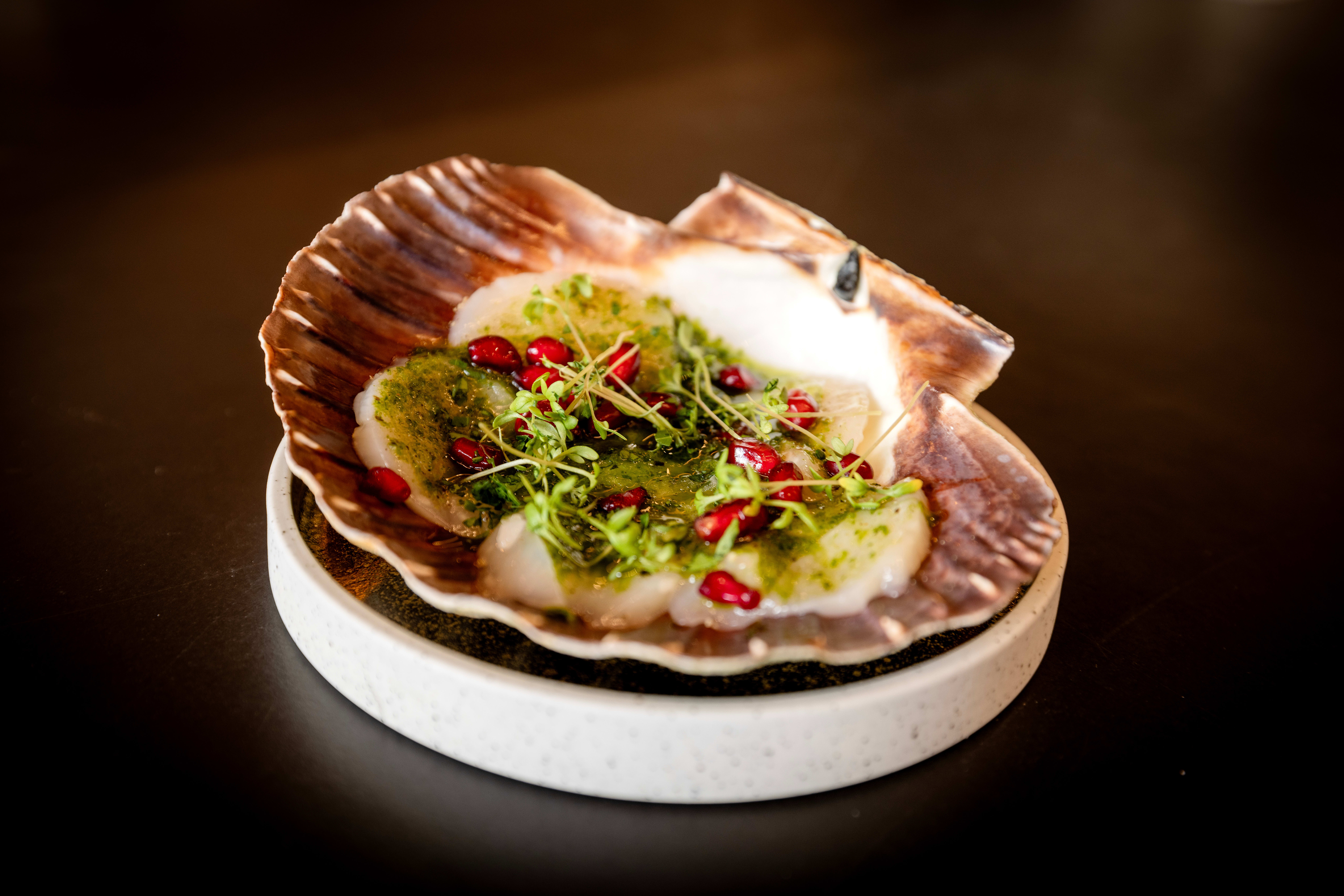 Råmarinert kamskjell med granateple og gremolata smaker mest av gremolata. Den italienske urtemiksen, kombinert med litt bittert og søtt granateple, blir i overkant dominerende til kamskjellet.