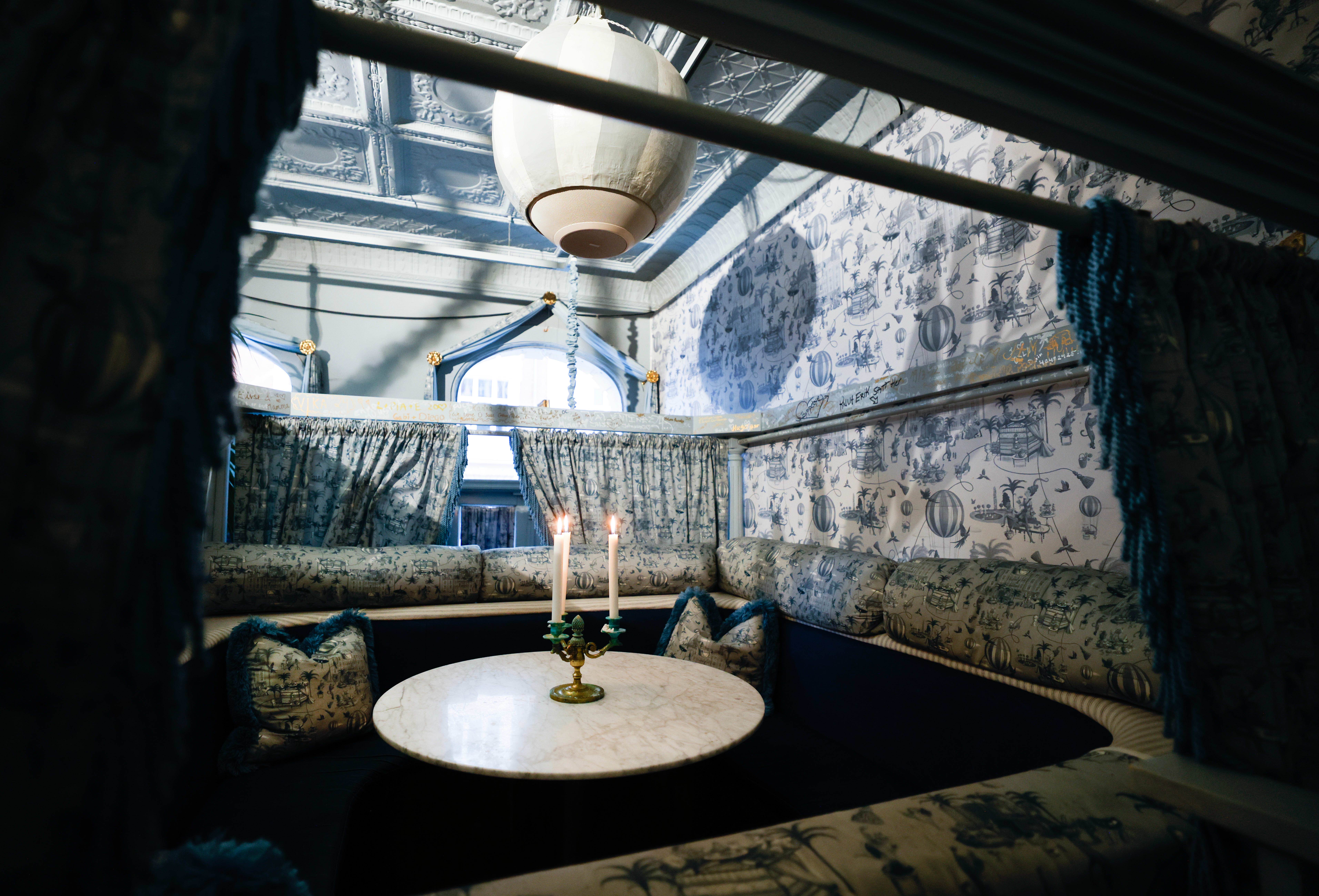 Noe annet møter oss når vi tar turen en torsdagskveld høsten 2025. Gardinene er ikke trukket for, døren står åpen, og vi kan se det overdådige interiøret med levende lys, fløyel, silkebånd og champagneflasker.