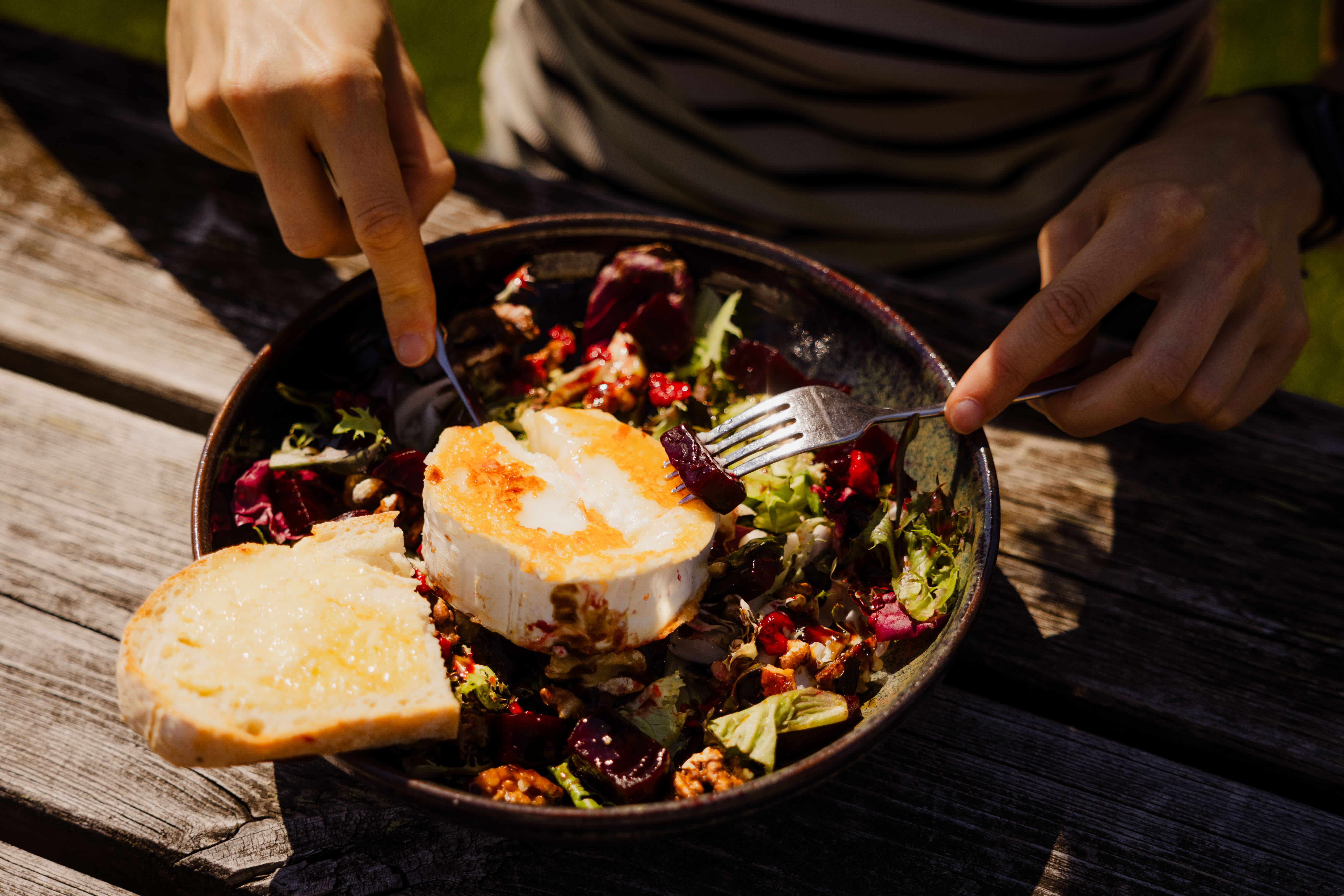 I tillegg serveres mange større lunsjretter, som denne rause chèvre-salaten.
