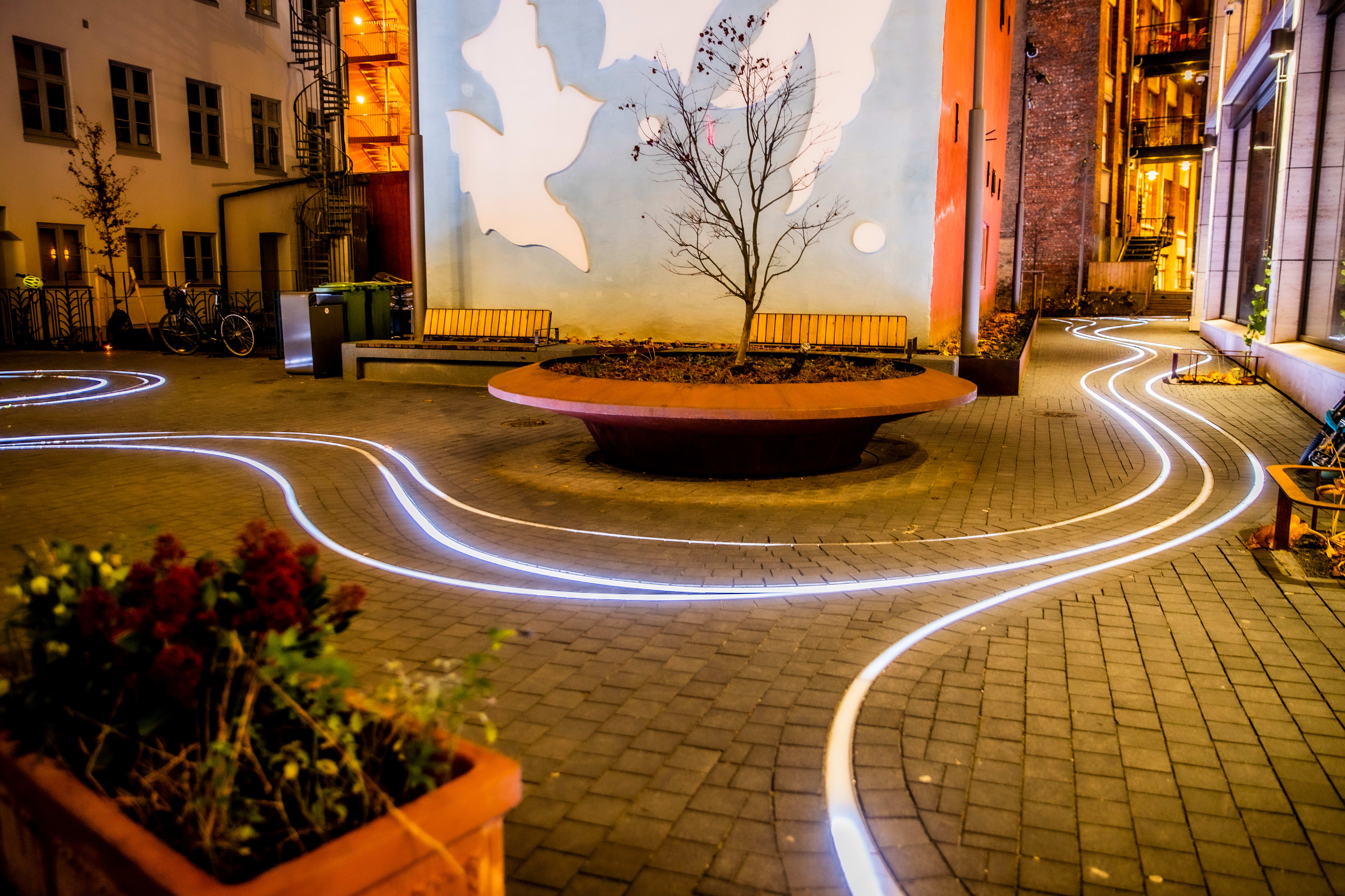 Klokken er 22. Pumpende musikk lokker fra alle hjørner. Denne lørdagskvelden følger vi lyskunsten langs asfalten inn mot Tullinløkkas bakgård, også kjent som Tullinkvartalet.