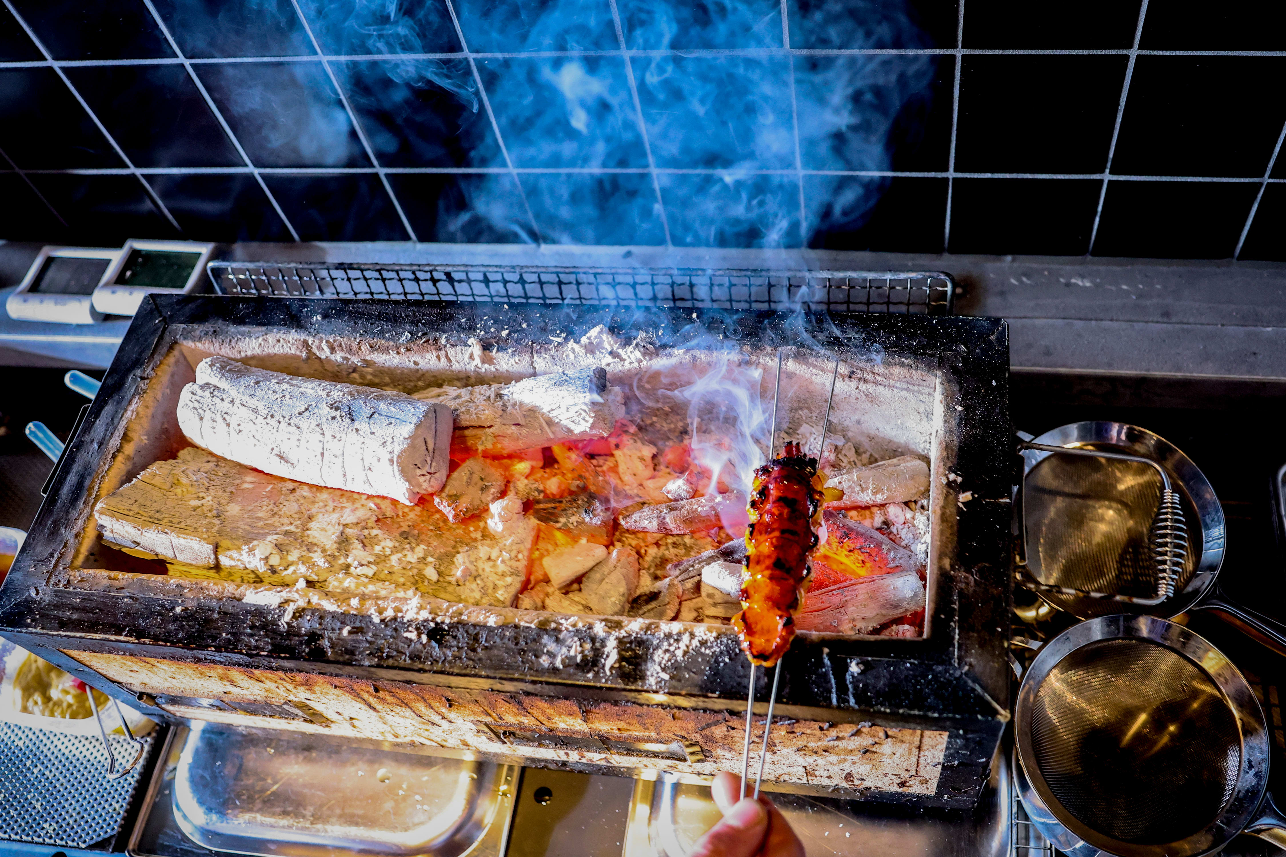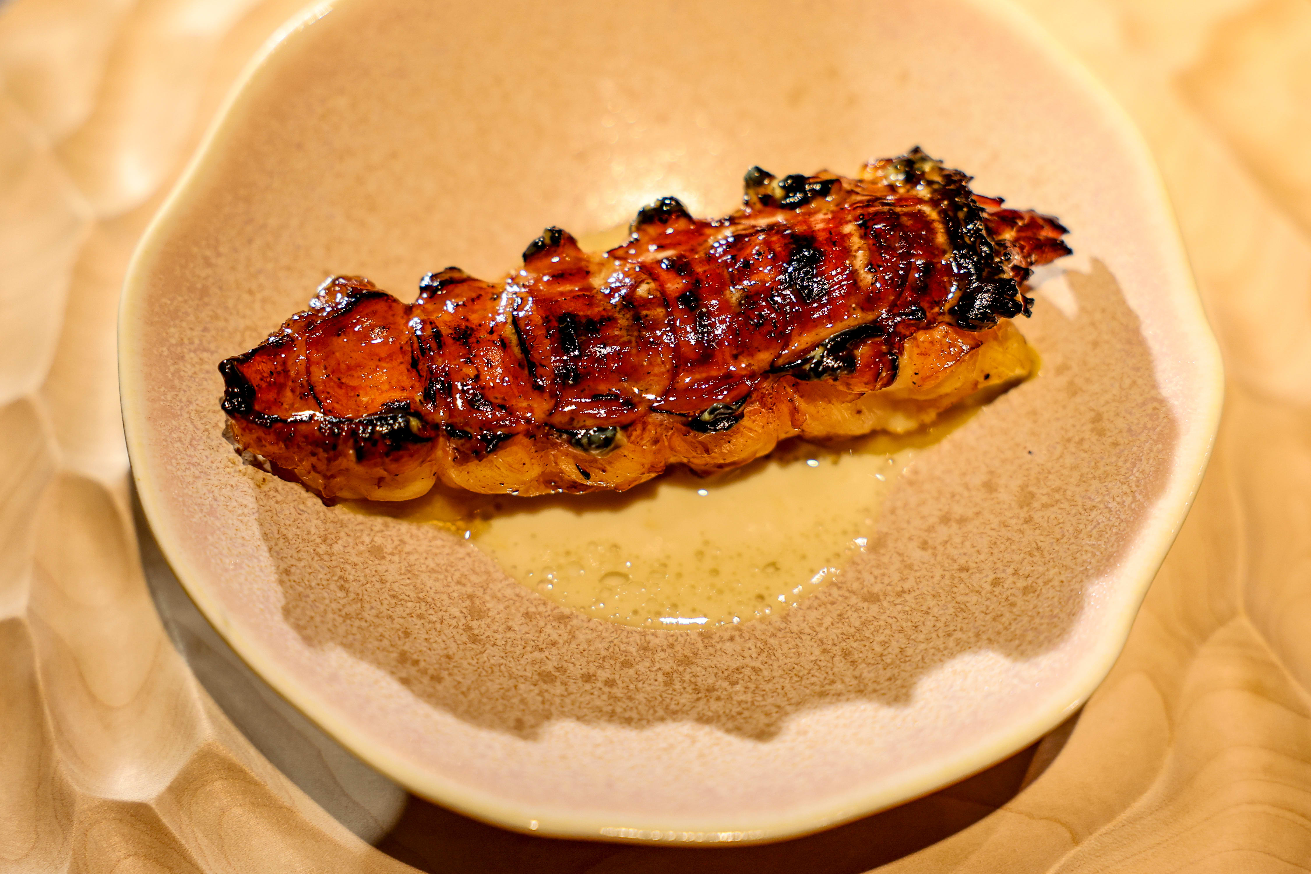 Etter en rask runde i fryseren, løsnes kjøttet fra skallet. Halen grilles over en yakitorigrill og pensles med karamellisert honningsmør.