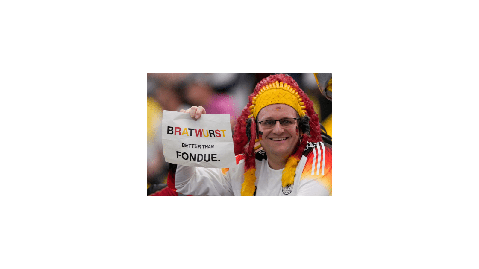Denne polske supporteren går til angrep Nederland. Kielbasa er nemlig en polsk pølse, som de mener er bedre enn den kjente goudaosten. Vel, vel.