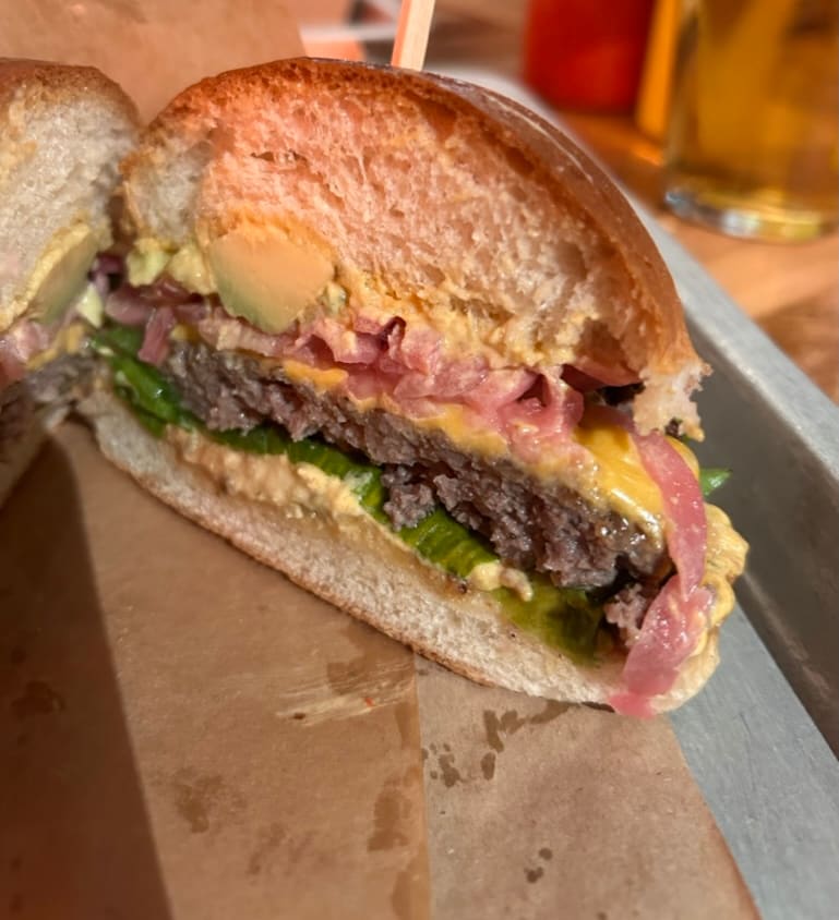 Avokado-burgeren blir litt smørje. Syltet løk er helt ihjelsyltet så den mister friskhet og blir helt myk. Dressingen her kalles «avokado mayo» og er dermed helt unødvendig – det er jo masse fersk avokado her.