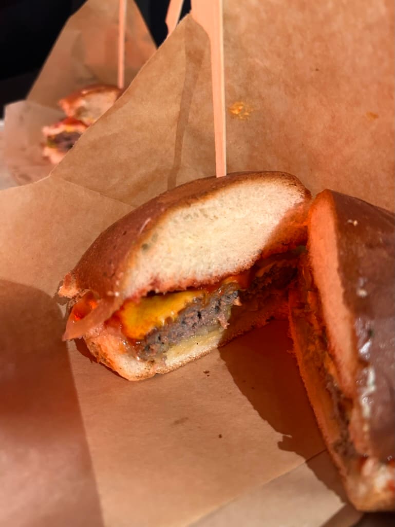 Fra disken serveres både øl og burgere på løpende bånd. Problemet er at burgerne ikke er så gode. En av dem kan du riktignok få julestemning av, men kebaben over gaten (Mediterranian) lager bedre mat.