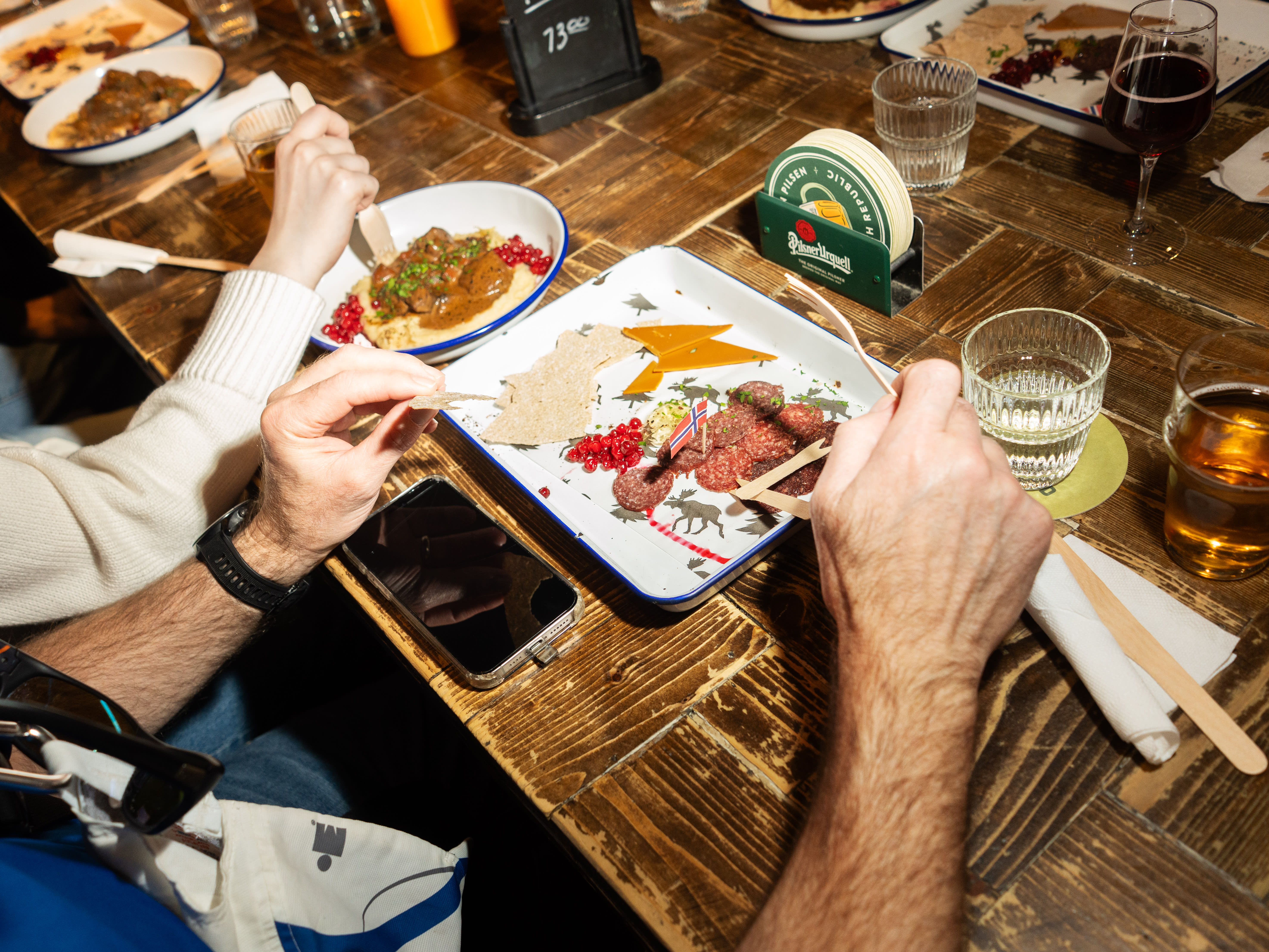Ved siden av kommer et slags charcuterie-brett bestående av elgpølse, reinsdyrpølse og hvalpølse pyntet med norsk flagg.
