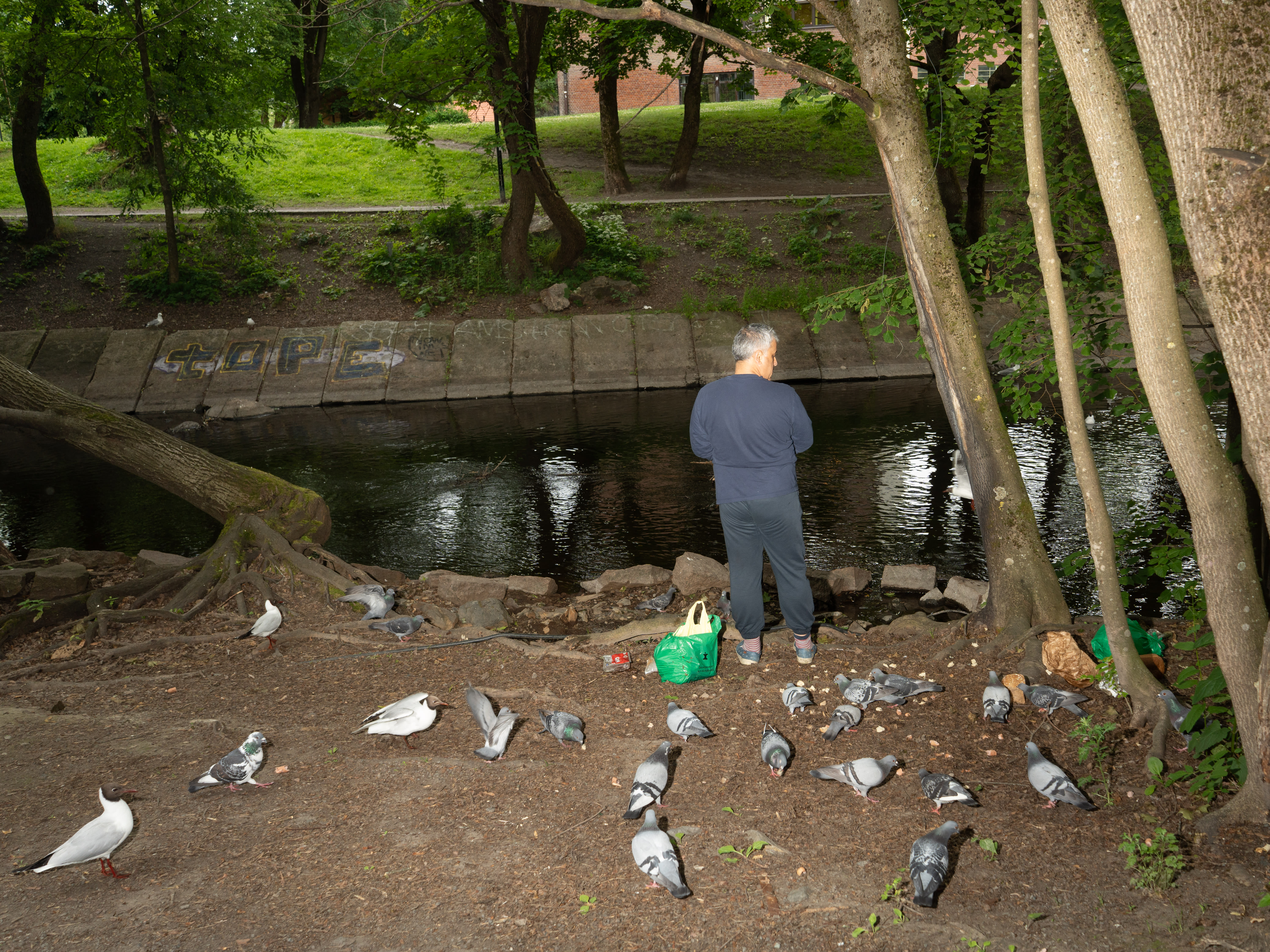 Her treffer vi blant annet en mann som mater fuglene med grillpølser fra Gilde.