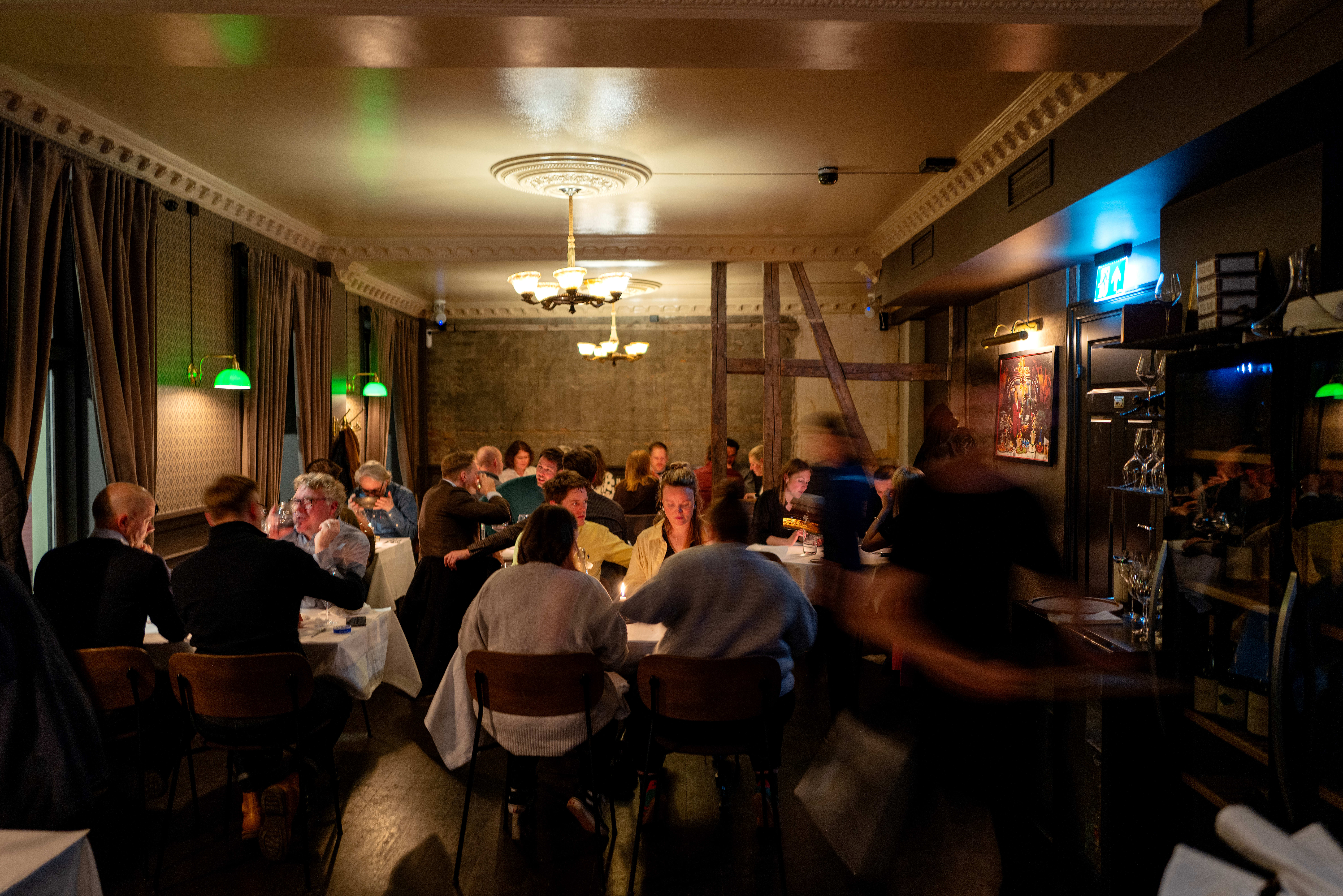 Vi får bord ved vinduet og elsker omgivelsene. De siste årene har mange nyåpnede restauranter vært så like i stilen, men her er det annerledes. Hvite duker, høye stearinlys på bordet. Den gamle bygårdens sjel er synlig flere steder. En murvegg, gamle trestolper, stukkatur i taket. Det er litt 50–60-tallsswung over det hele, med brune toner og noen likhetstrekk med Bar Amour på St. Hanshaugen.