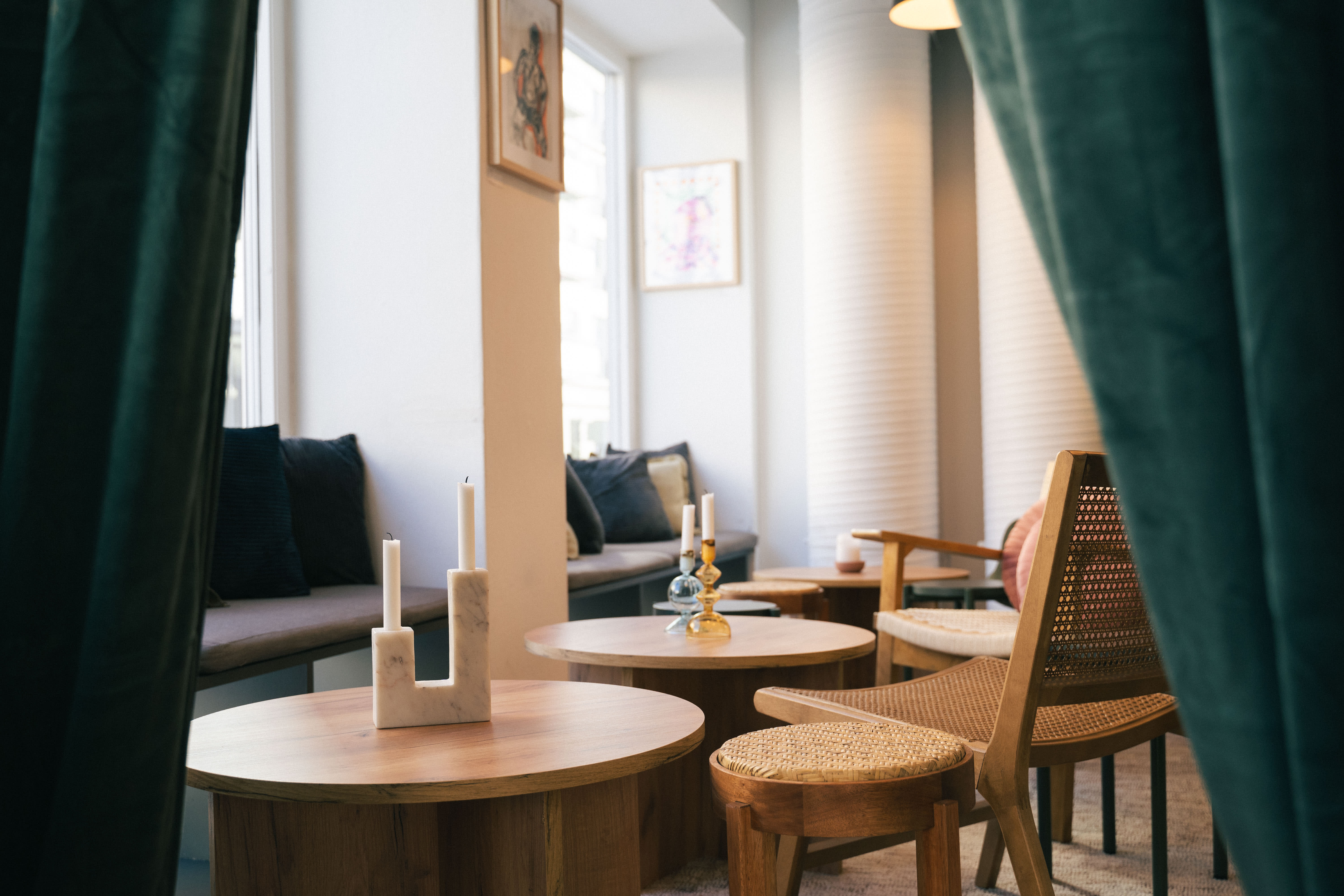 Vinbaren er i samme lokale som restauranten, men har en litt avskjermet plassering til venstre for inngangen. Foran baren har de plassert tre lave bord. Det er en myk benk som går langs hele vinduet og lave lounge-møbler.