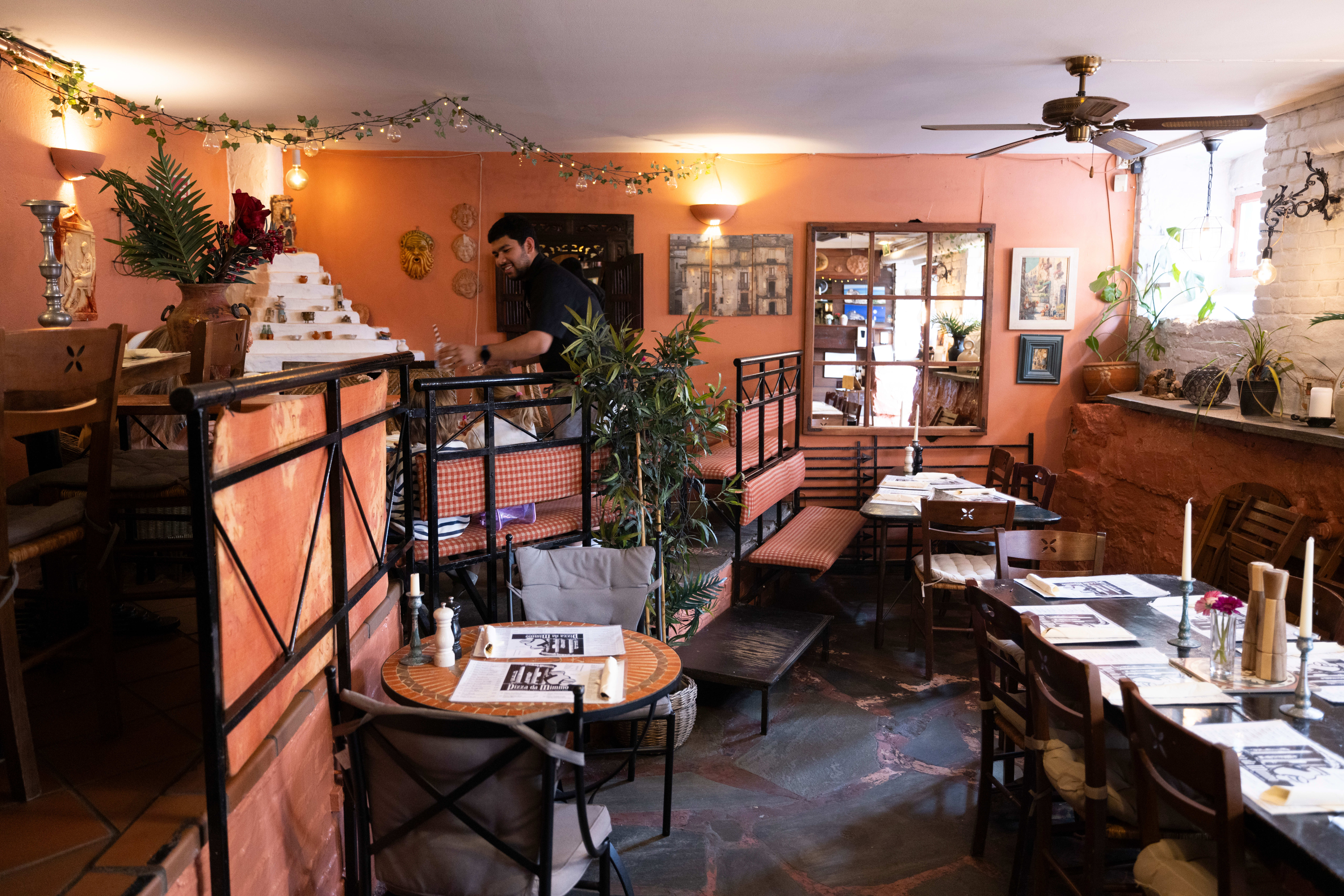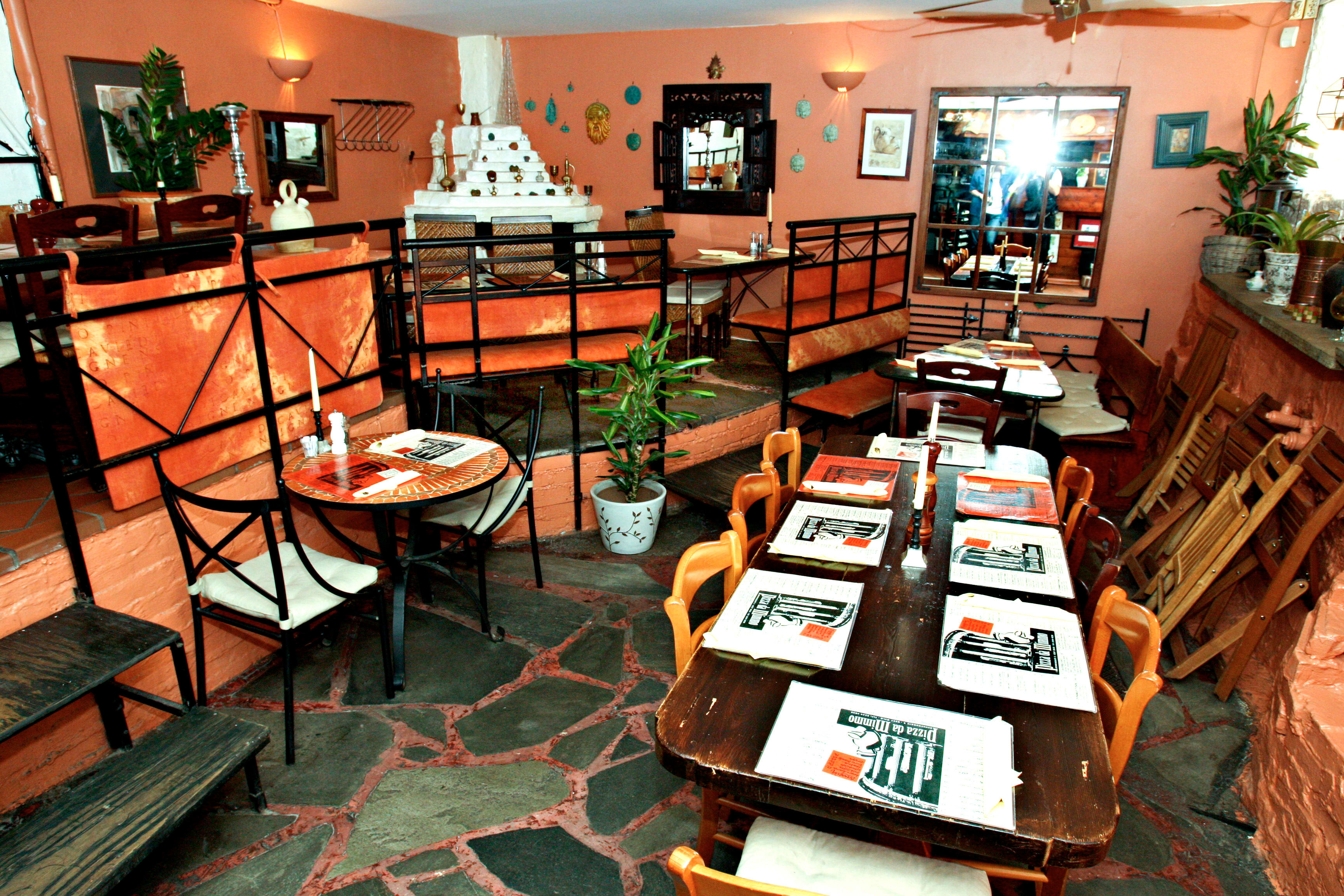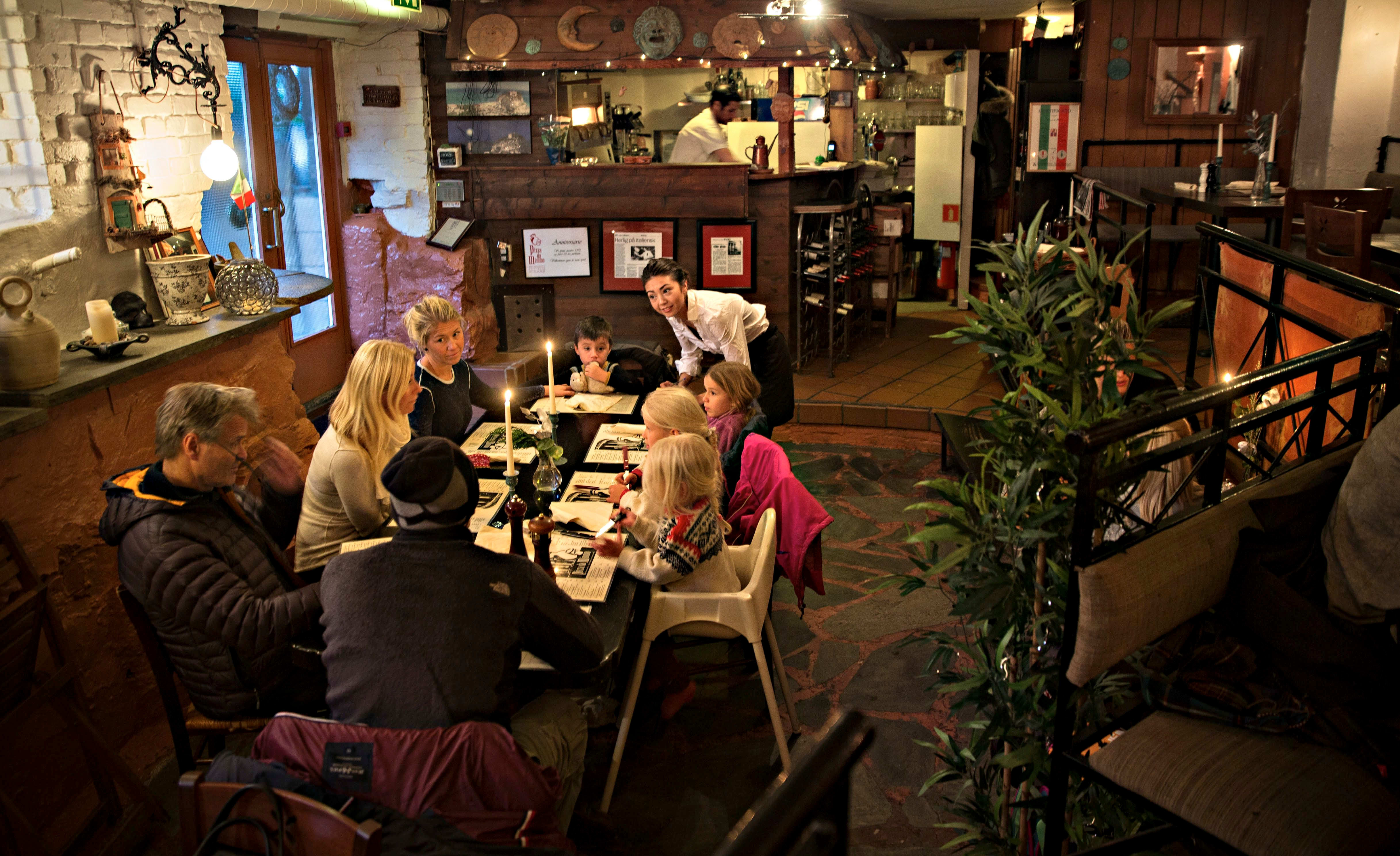 En stamgjest hvisker til kjæresten sin og peker med et nikk mot vårt bord. Vi har fått ett av to bord som er plassert på et slags platå. For her er vi liksom i en slags fjellby. La oss kalle det et slags Positano, vi sitter på verandaer både høyt og lavt. Utsikten er ikke Middelhavet, men et kjøkken der det jobbes hardt, og en hvitmalt murvegg med souvenirer fra Italia.