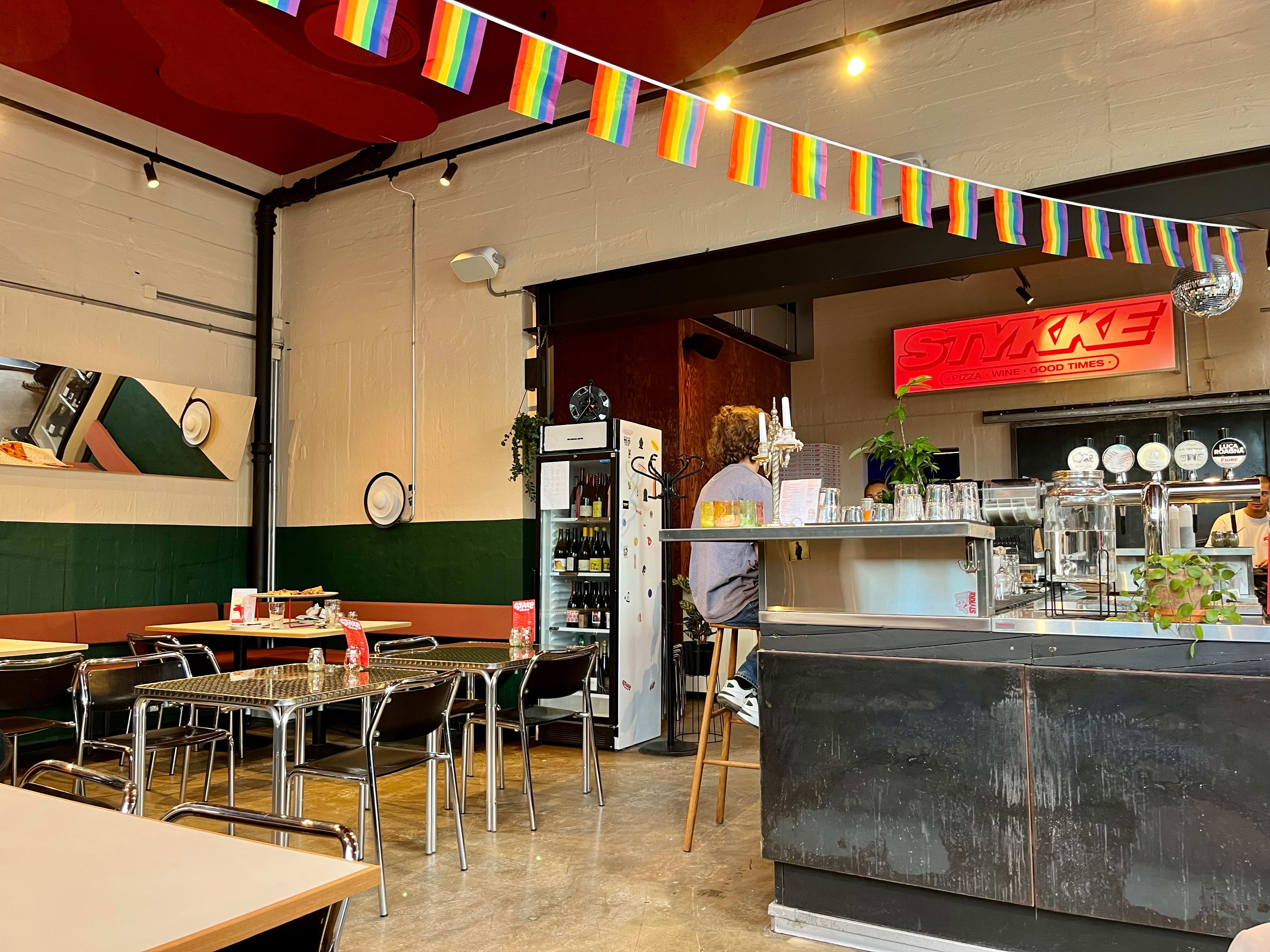 Hos Stykke får du ikke italiensk pizza. Her er det New York-stilen som gjelder, med litt tykkere skorpe, sprø bunn og store stykker som kan brettes. Pizzaene selges både hele og i stykker, inspirert av såkalte «slice shops».