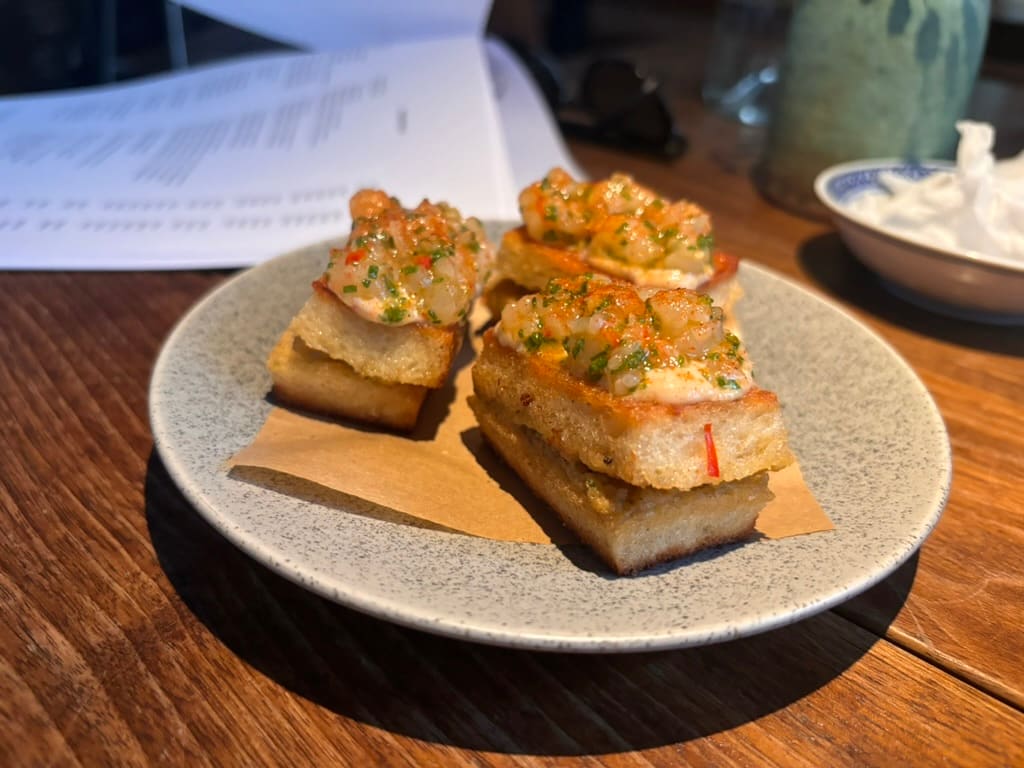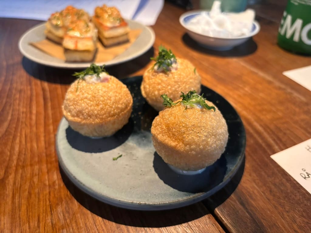 For eksempel får vi Pani puri, altså en indisk, fritert og hul liten brødkule. Den er så crisp som den kan bli, ikke pappaktig som juksevarianten. På innsiden får klokjøtt fra taskekrabbe selskap av grønn tomat, grillet lime og koriander. Det kommer også fruktig dybde fra tamarind. Overraskende, men en utrolig vellykket kombinasjon.