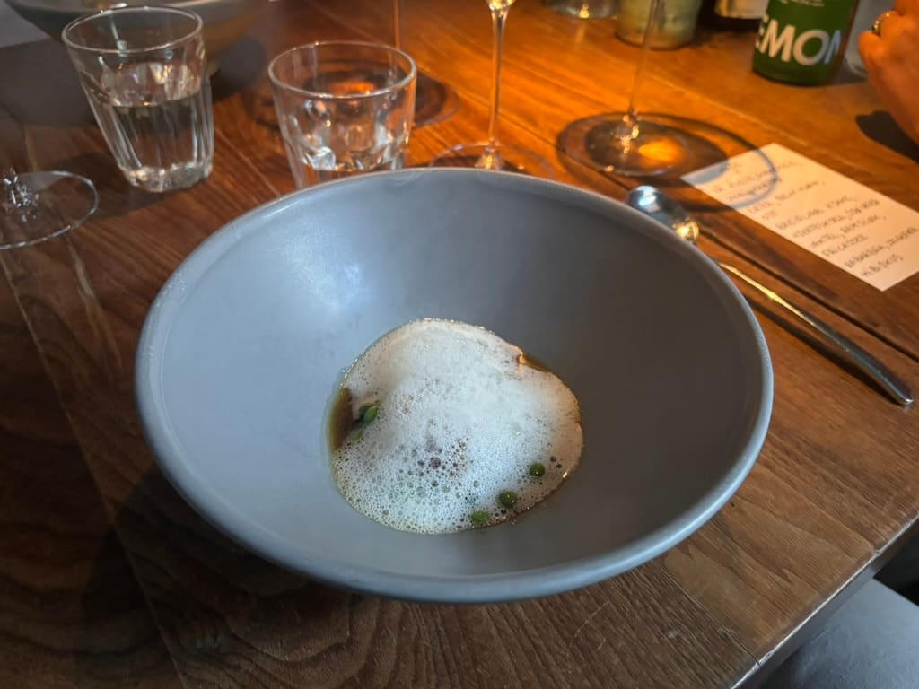 Vi finner også en brun ert som burde vært sortert bort. Men hvem bryr seg om det når smakene sitter så godt: Lett grillede erter har selskap av blant annet beinmarg og comté. Retten er mesterlig balansert med store mengder syre opp mot umami-smakene.