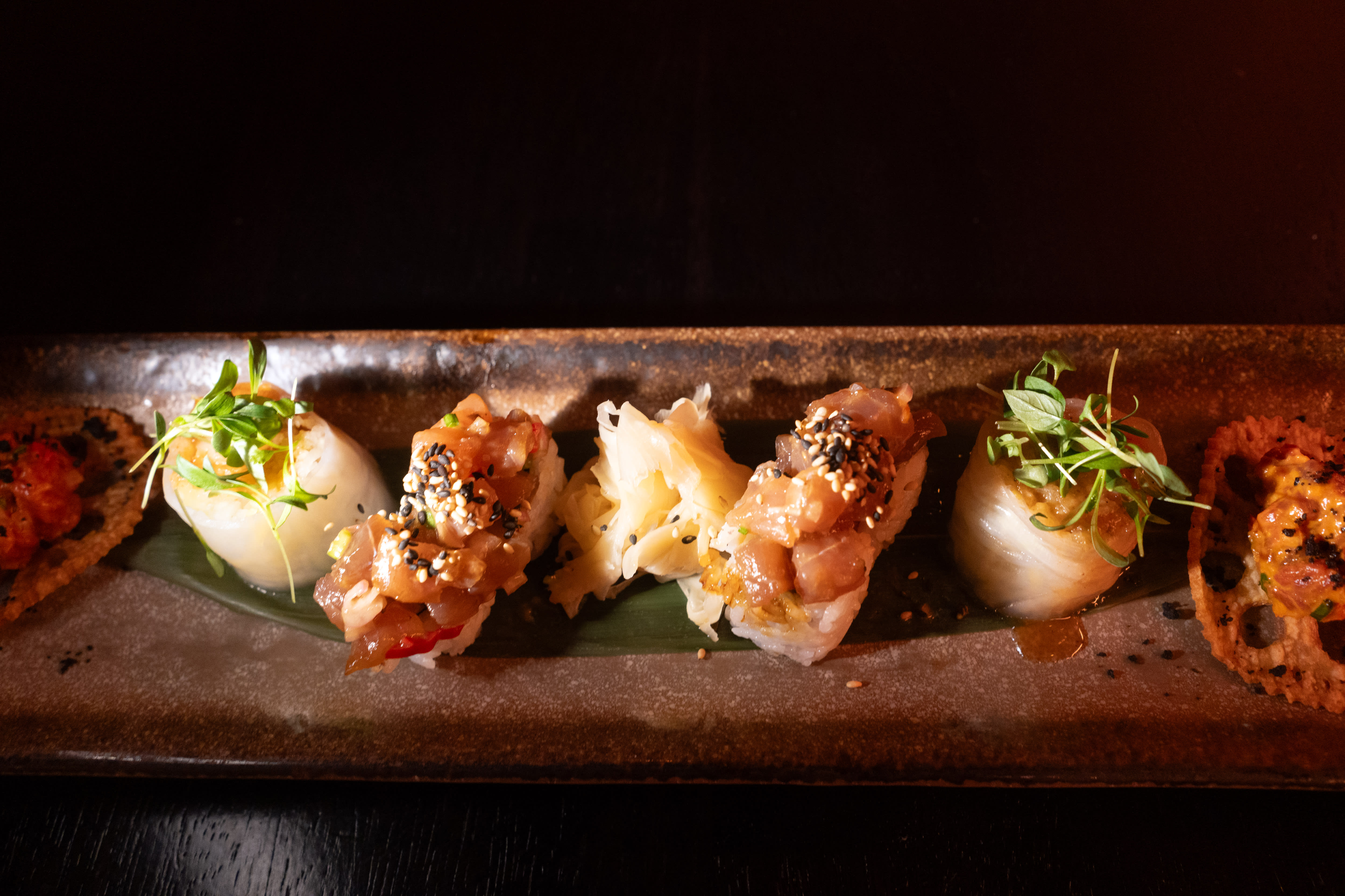 Den blide servitøren setter nå en plate med flere småretter på bordet. Den kjedeligste er en tam tunfiskmaki med svarte og hvite sesamfrø på toppen. Da er det mer schwung over de ferske vårrullene. Knasende sprø med en fin rekesmak blandet med søtlig tamarindsaus. Her er også vakker lotuschips toppet med biff tartar.