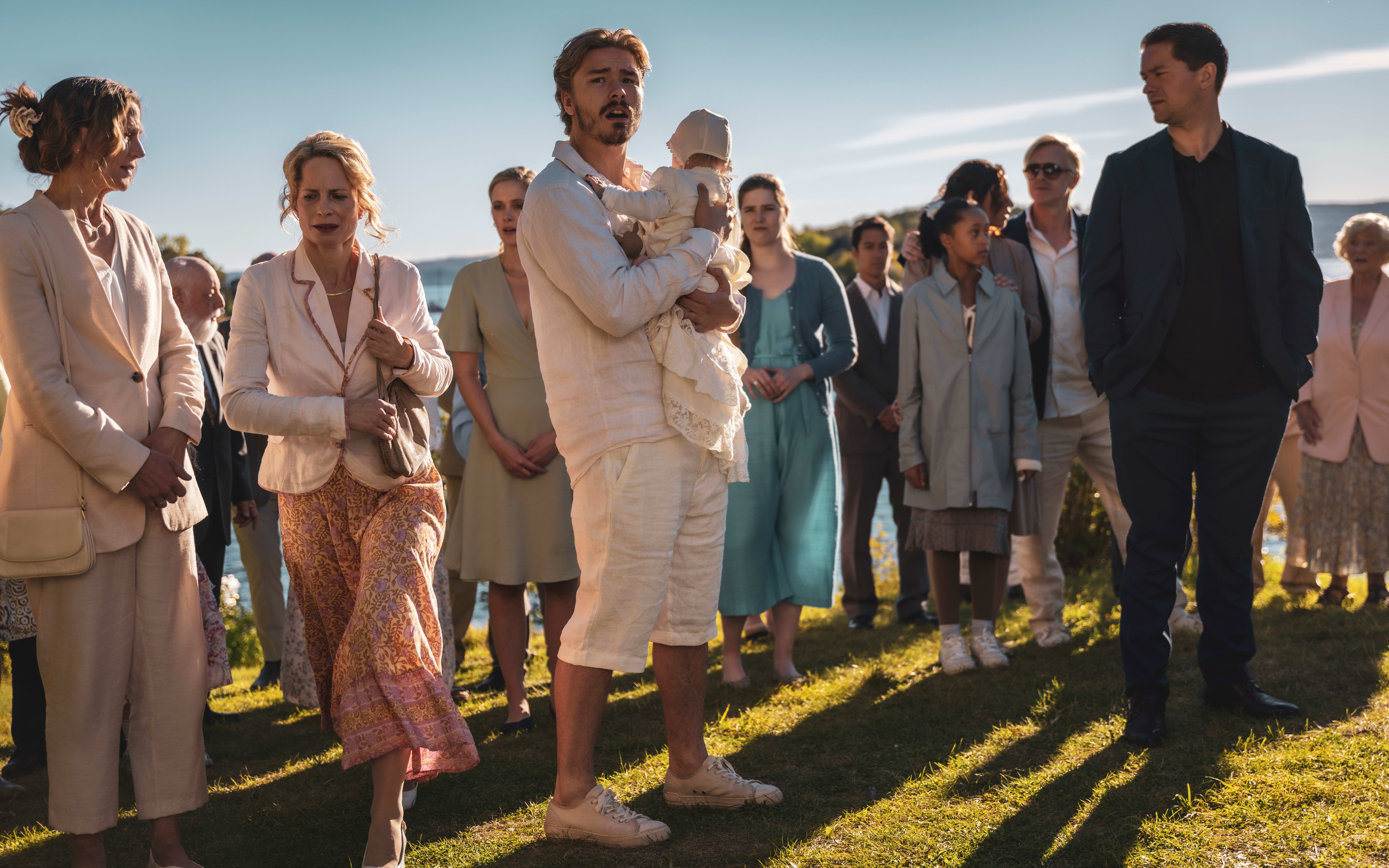 La oss starte med det som funker. Det er barnedåp en gang midt på 2000-tallet. Balder (Jonas Hoff Oftebro) skal døpe datteren og har samlet storfamilien. Pappa Lars Bang (Seim) er ikke invitert, men dukker opp likevel.