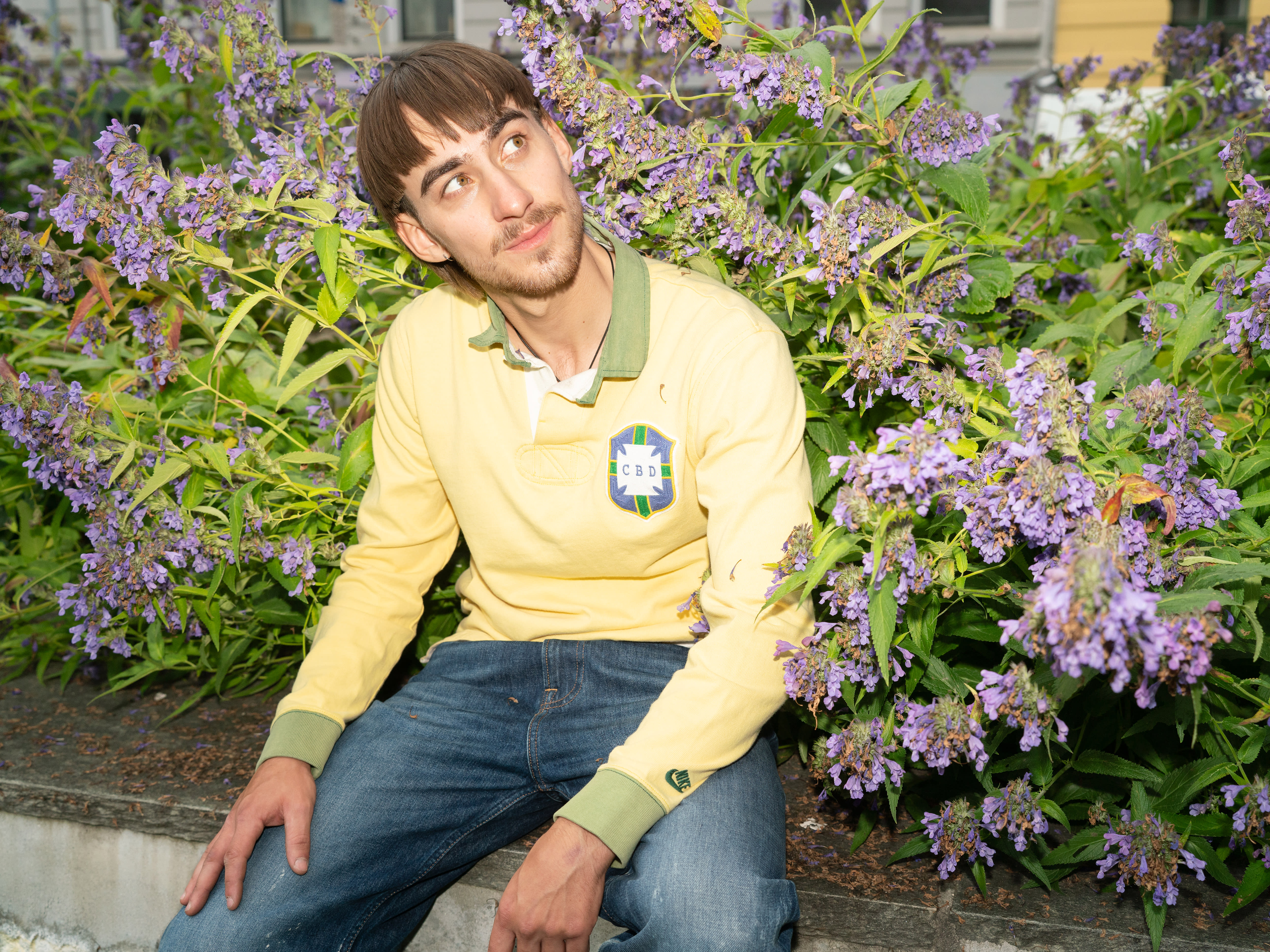 Håret er klippet i en slags bolleklipp, på overkroppen har han en gul trøye med et lagemblem på brystet. Det er herlig avslappet og guttete.