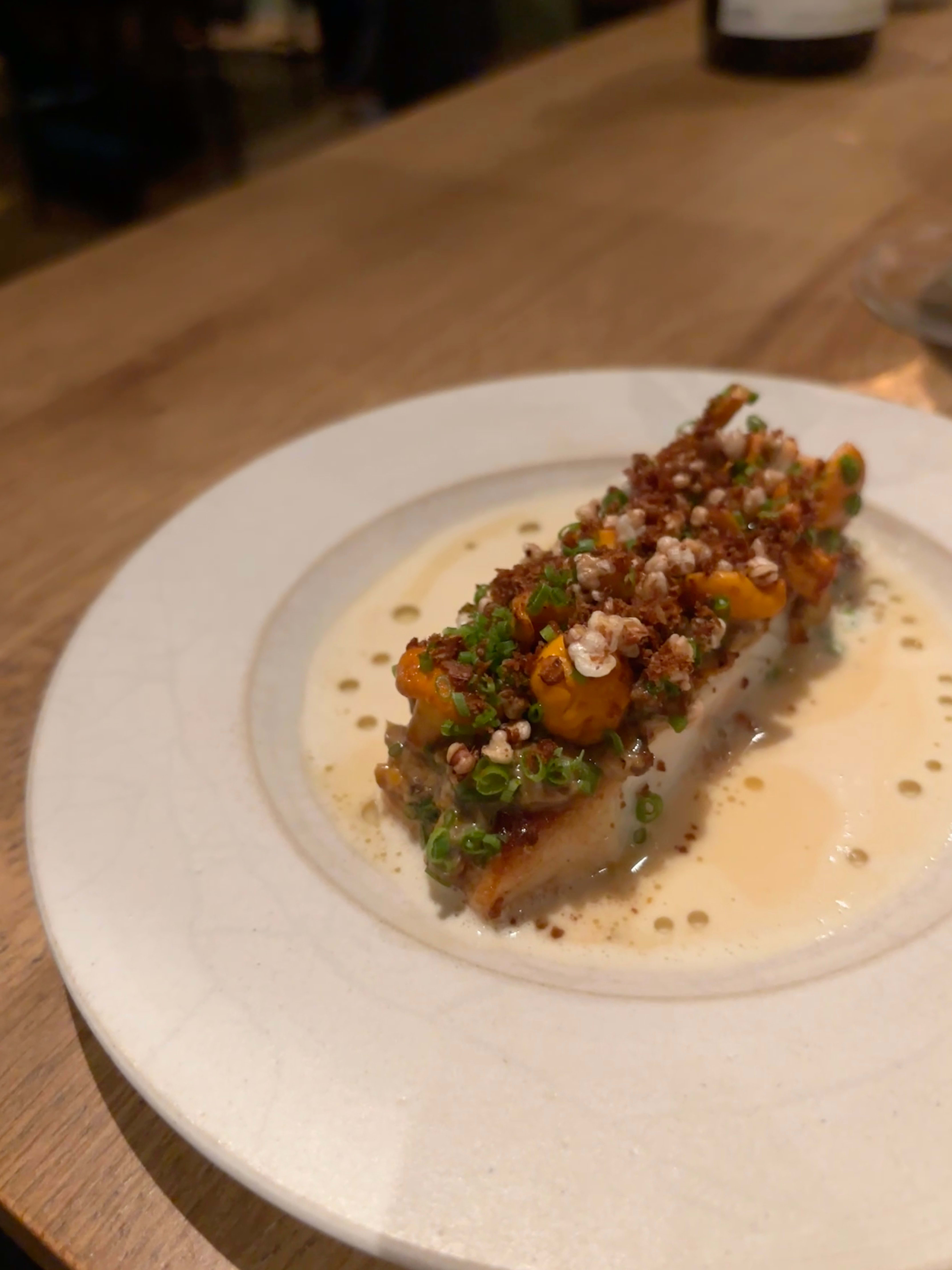 Når vi har fått i oss halve, kommer piggvaren, så man kan dyppe i sausen, laget på kraft fra piggvarens hode. Dyp fiskesmak og syrlighet kombineres med sopp og ulike teksturer. Det er både pent og raffinert. Men til vår overraskelse er fiskestykkene våre et lite hakk overbehandlet.