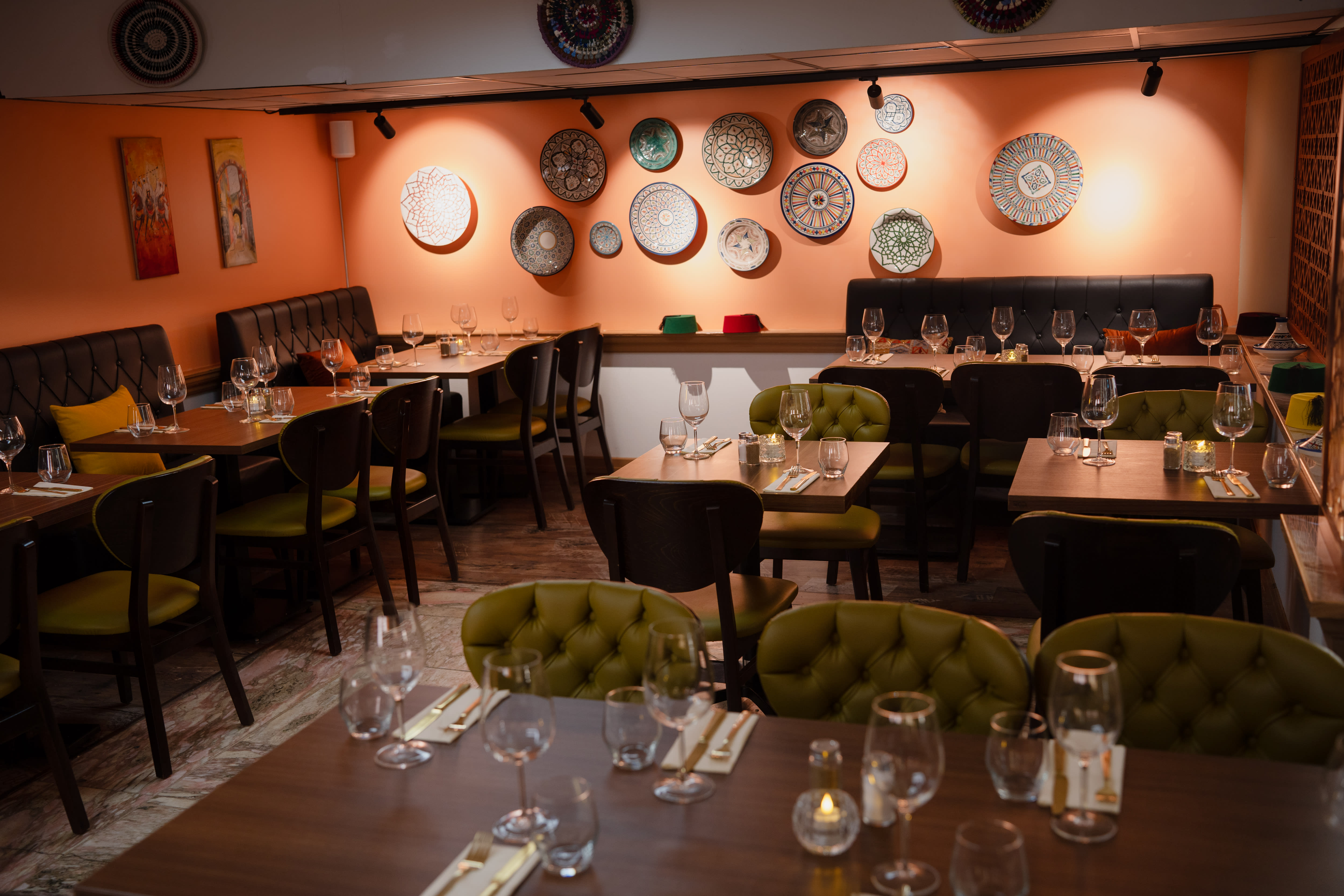 Estetikken som møter oss nede, gjør at spa og klor fort er glemt. Her er marokkanske fat, bilder og annen dekor spredt over de store lokalene. Restauranten er delt opp i flere soner ved hjelp av mønstrede skillevegger og hesteskoformede buer.