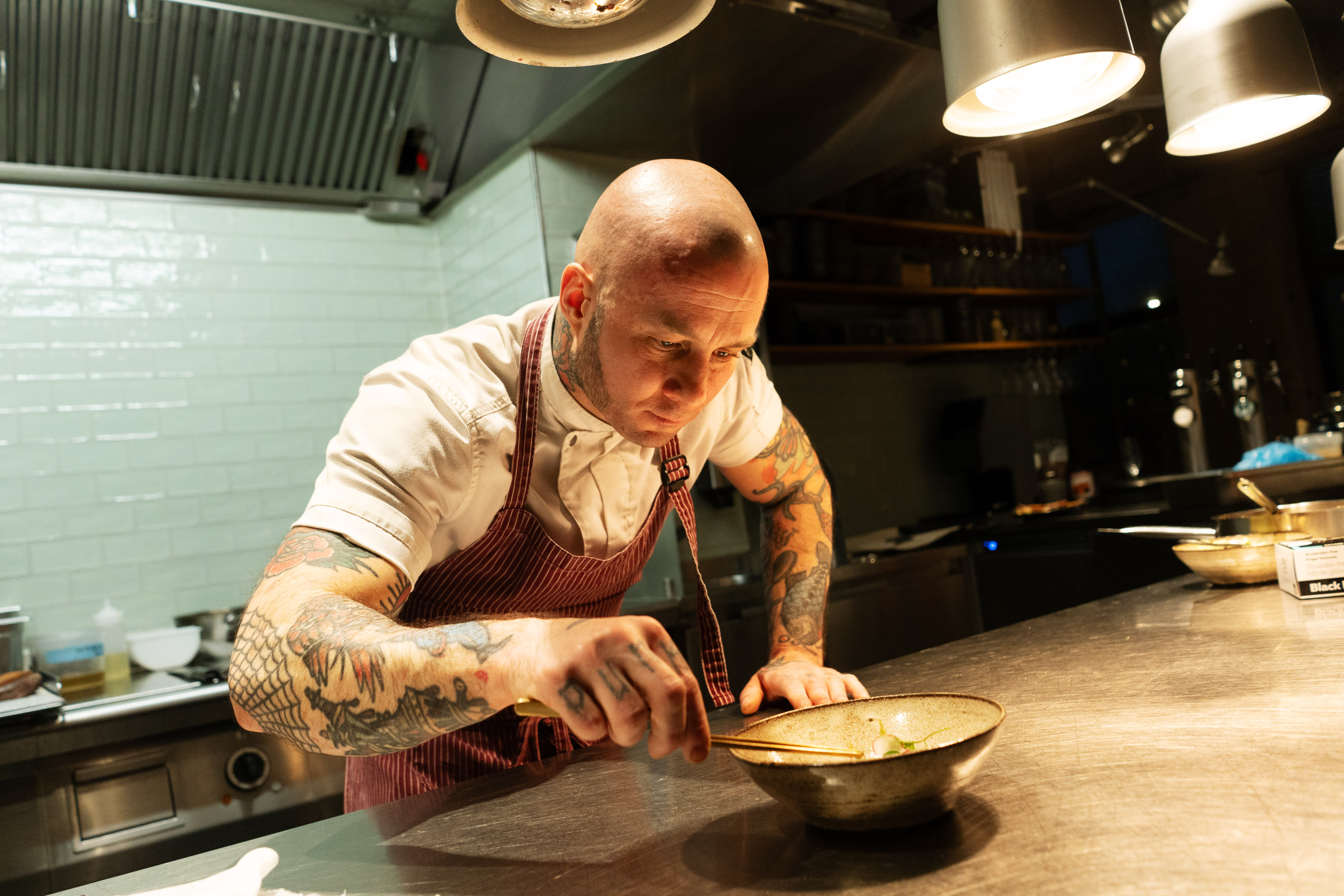 Vi får et bord rett foran kjøkkenet. Dinglende varmelamper, bulende kokkemuskler og gjennomsiktige bokser med ingredienser preger synsfeltet. Det føles som å være midt i en episode av «The Bear». Heldigvis blir det mye hyggeligere.