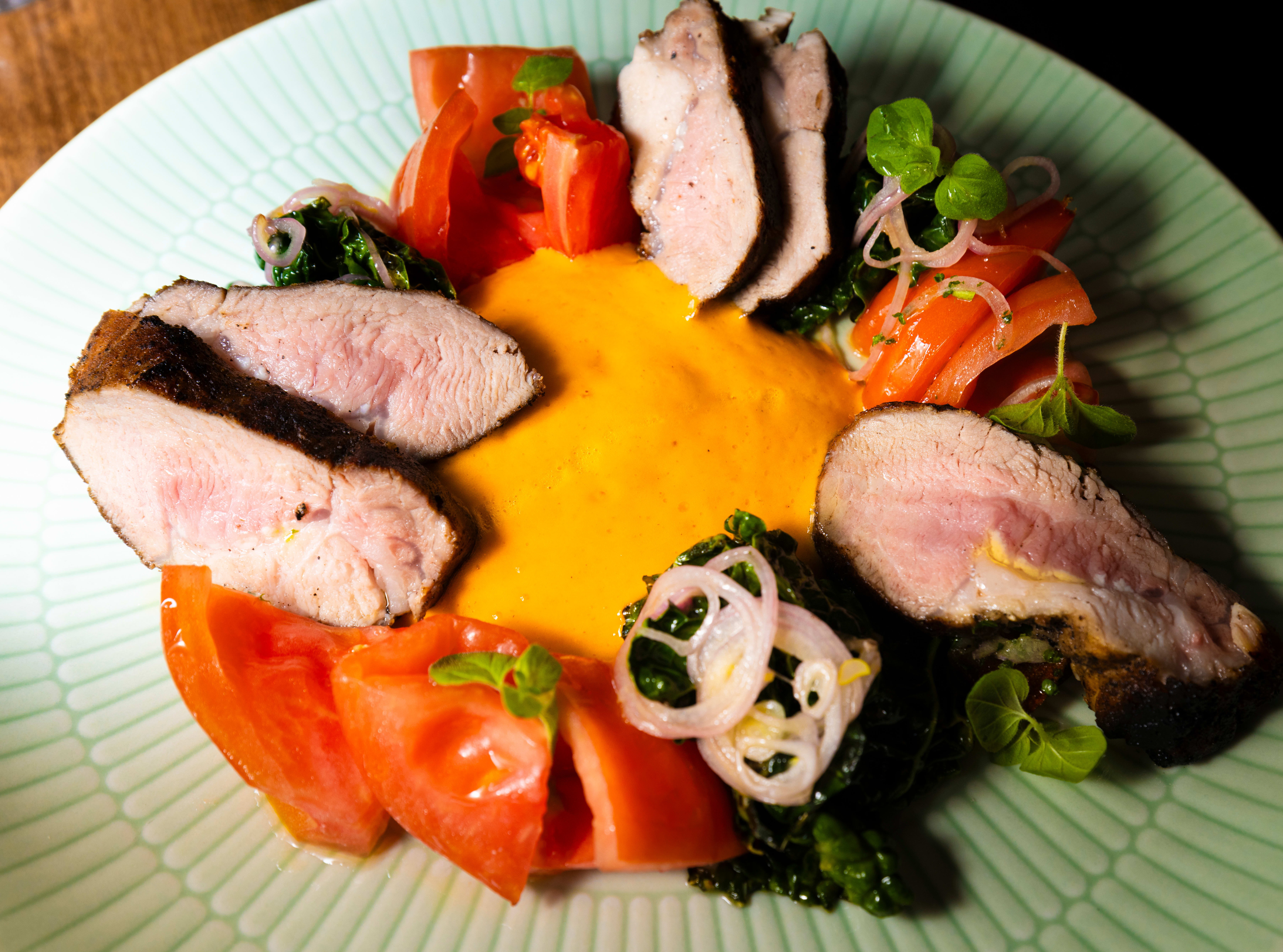 Han velger en like klassisk kombinasjon til hovedretten: lammesadel og lammeribbe med squash og en frisk sauce verde. Til dette får vi kjøttfull, jordlig og krydret syrah fra Nord-Rhone.