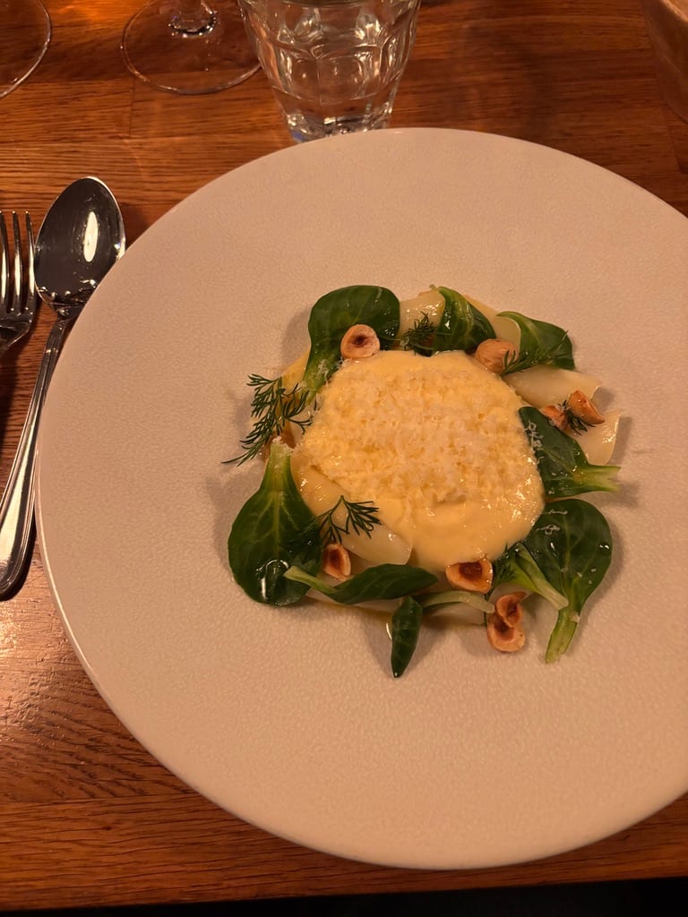 Han lyser opp da vi spør om vin til forretten: vårens første asparges med sherrysaus, hasselnøtter og comté. En utrolig pen rett med perfekt møre asparges.
