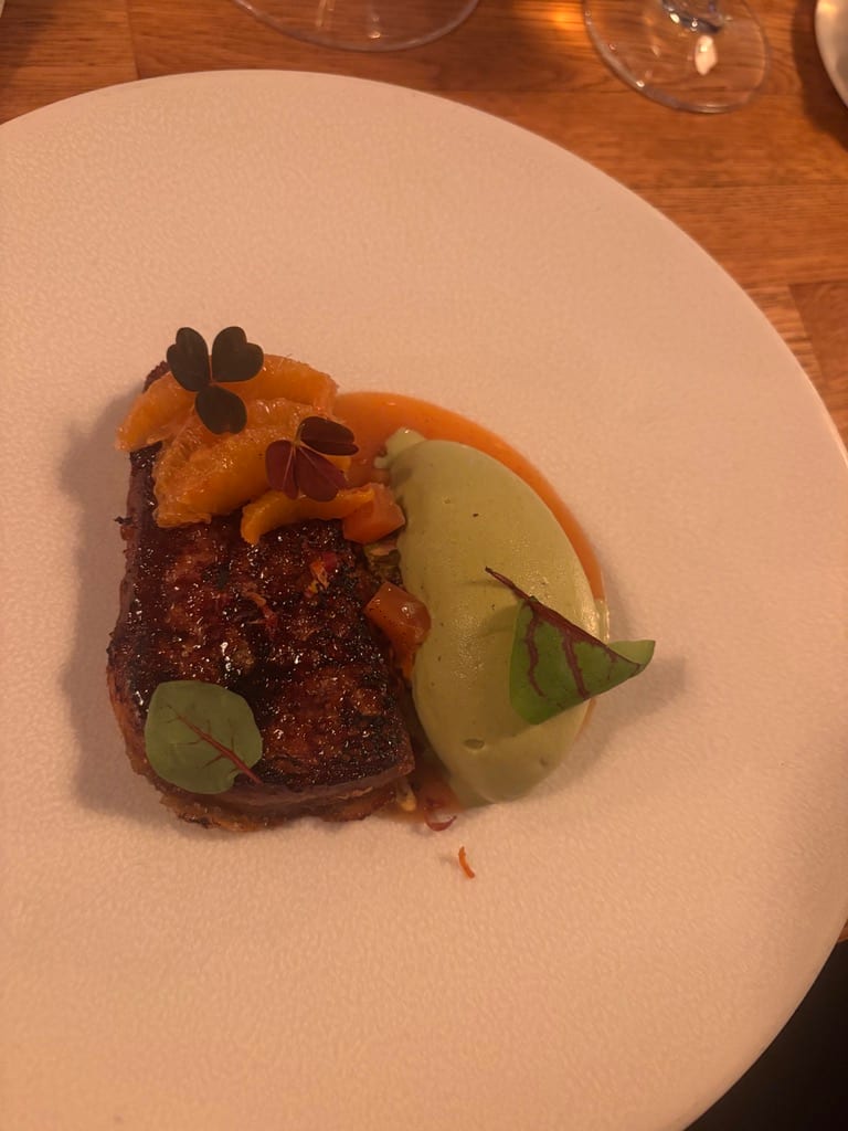 Til desserten fortsetter servitøren å leke seg. Vi får arme riddere, fuktige inni og karamelliserte på utsiden, med silkemyk pistasjis og blodappelsin. Servitøren finner frem tre ulike dessertviner på et blunk og lukter på dem. «Den!» sier blikket hans. Så skjenker han oss et halvt glass sauternes og spør om vi kan lukte appelsin. Det kan vi – litt bitter appelsin oppi alt det fruktige og søte.