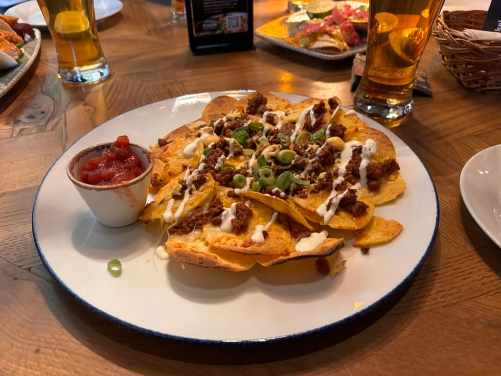Ostegratinerte nachos (215 kroner) smaker standard norsk tacokrydder. Altså ingen usmak, men du får det til bedre hjemme. Mengden kjøtt er svært beskjeden med tanke på prisen. Srirachamajonesen smaker ikke av chilisausen i det hele tatt.