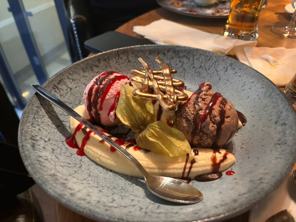Bananasplit (152 kroner) er en absurd komposisjon med en gullfarget sjokoladekreasjon på toppen. Bananene er harde og isen medioker.