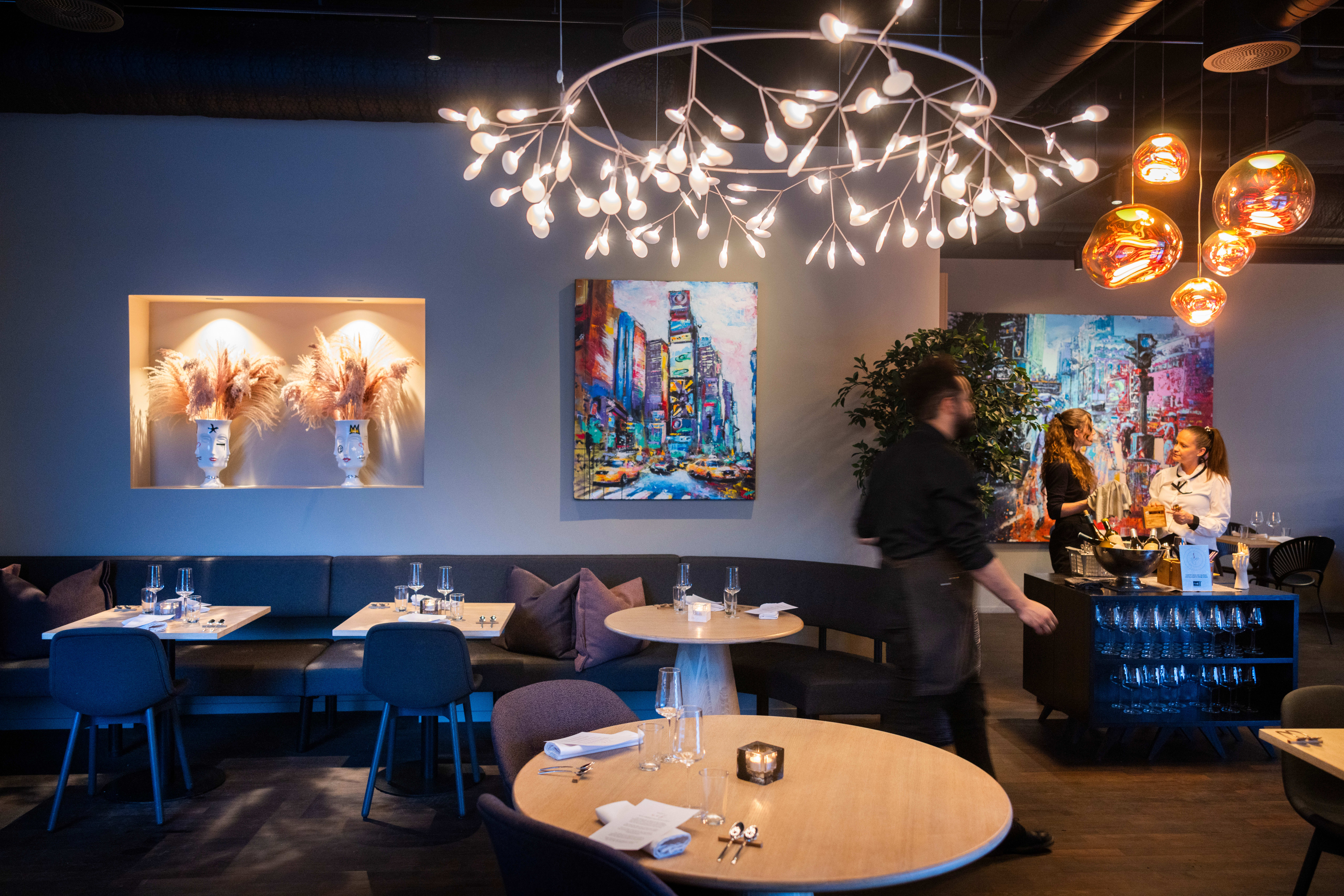 Lokalet er ikke så stort, men det er smart innredet med lyse trebord, mørke sittegrupper og noen fargerike bilder. Servitørene er proffe, men «nedpå» og får deg til å slappe av.
