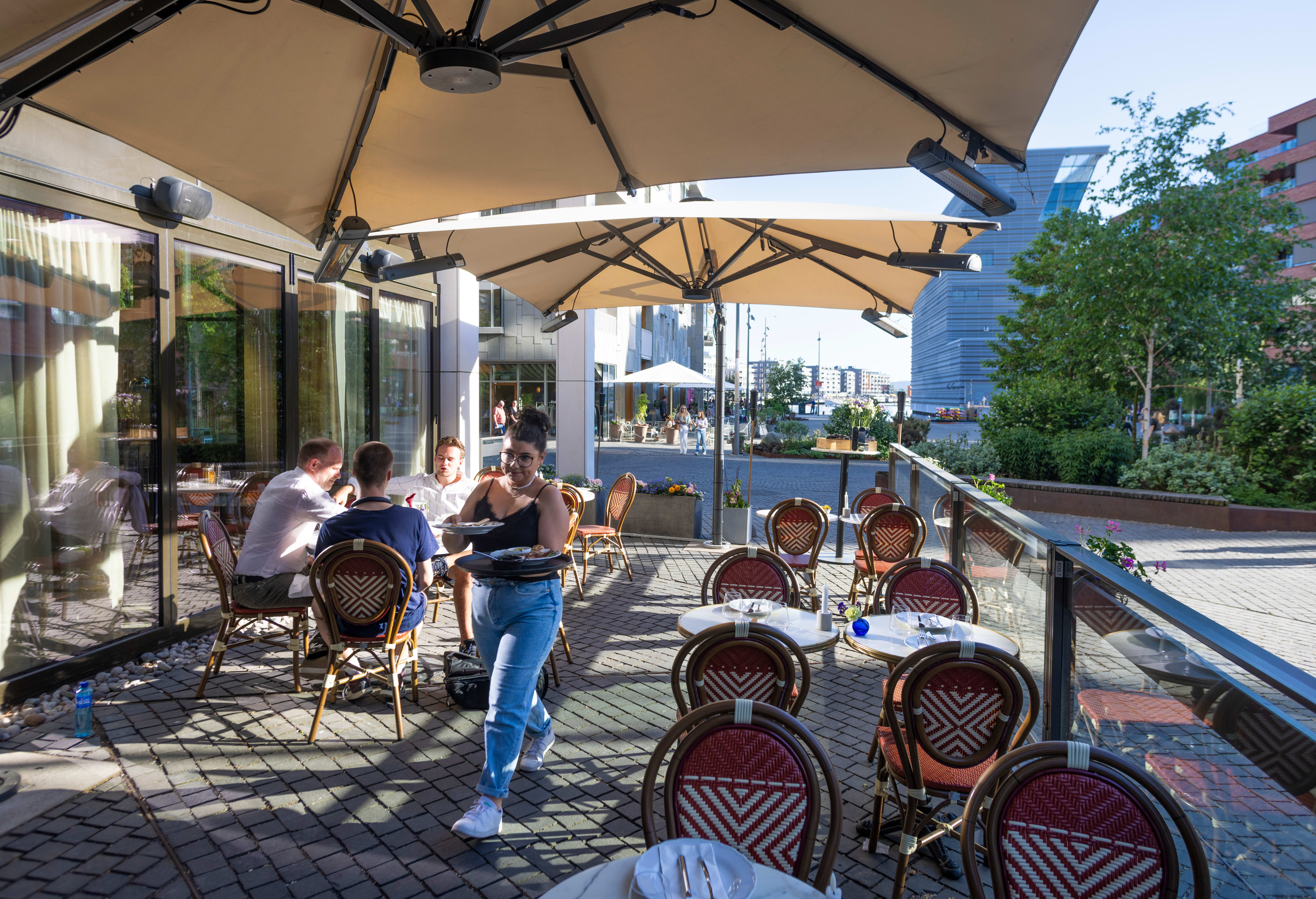 Uteserveringen er stort sett den samme, marmorbordene er beholdt, men menyen har est ut. Filosofien er at «måltider blir bedre når de deles med familie, venner eller kolleger». Hovedrettene skal derfor serveres fra store fat, og maten er inspirert av landene rundt Middelhavet. De gjør det ikke lett for seg selv.