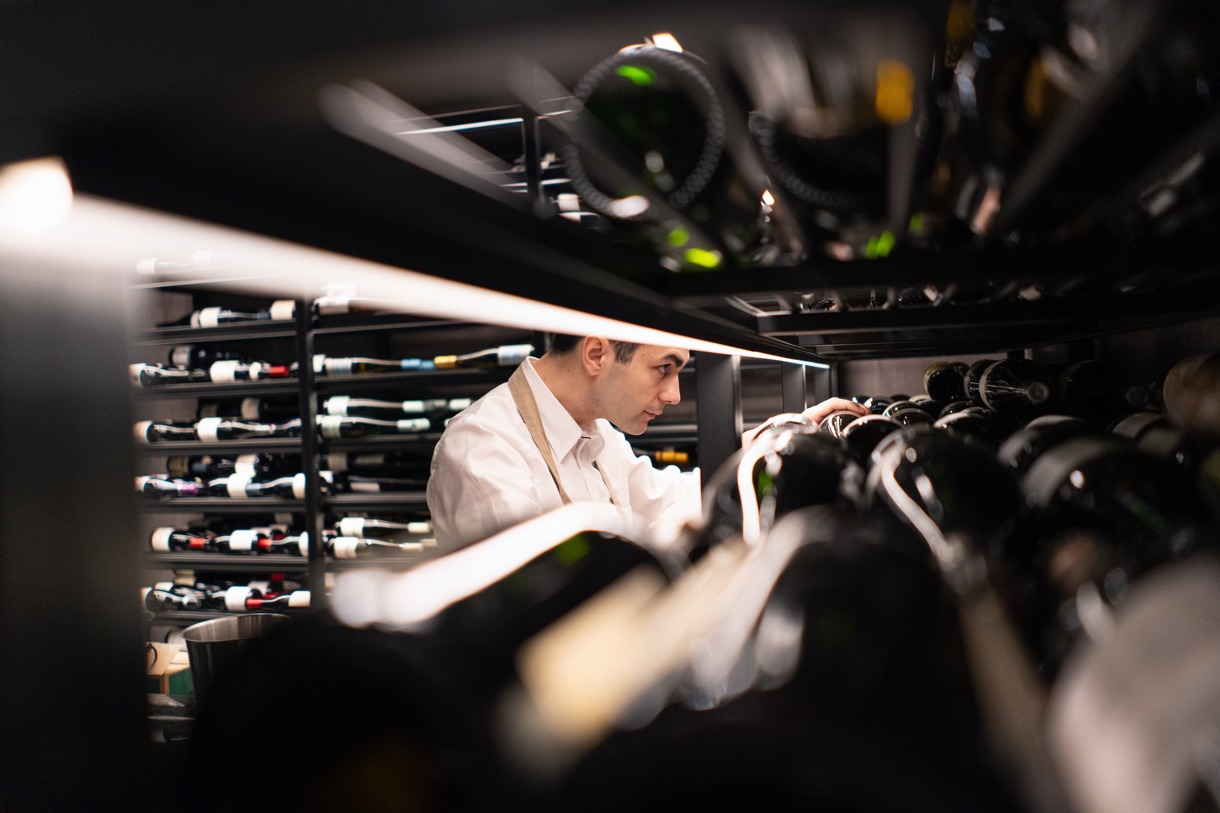 Vinbaren har en mørk og maskulin stil, og veggene er fylt opp med vinflasker fra gulv til tak. Foto: Ketil Blom Haugstulen