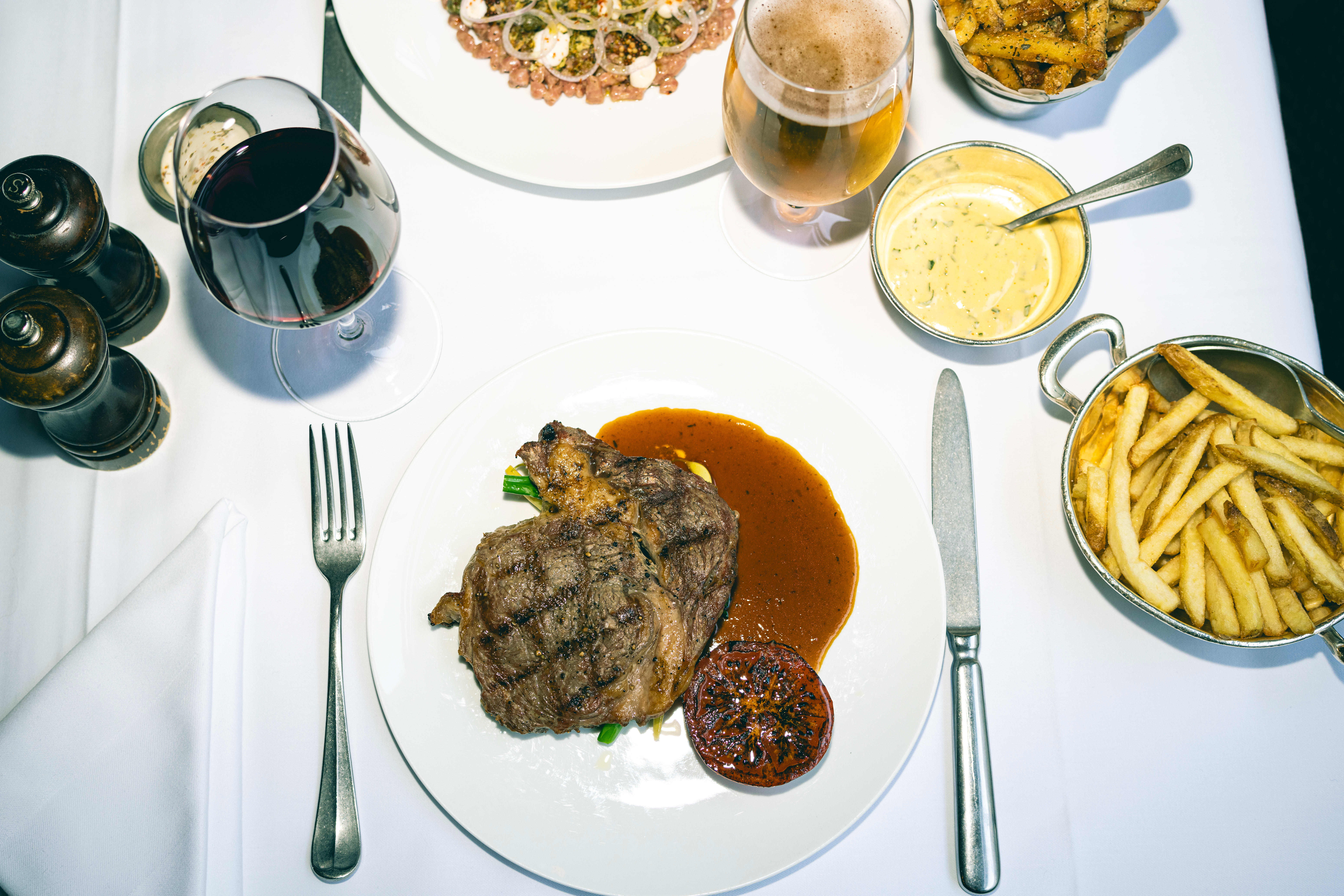 Biffen (steak frites: 565 kroner) skuffer stort. Vi bestiller medium, men den er stekt langt forbi. Stekeskorpen er ujevn, stykket er brent i kantene og flisete skåret. Aspargesbønnene er lunkne fra start. Den bakte tomaten, brent med gassbrenner, er helt kald når jeg kommer til den. Sausen engasjerer langt mer. Den smaker tydelig av grønt pepper. Friesen er sprø og godt krydret.
