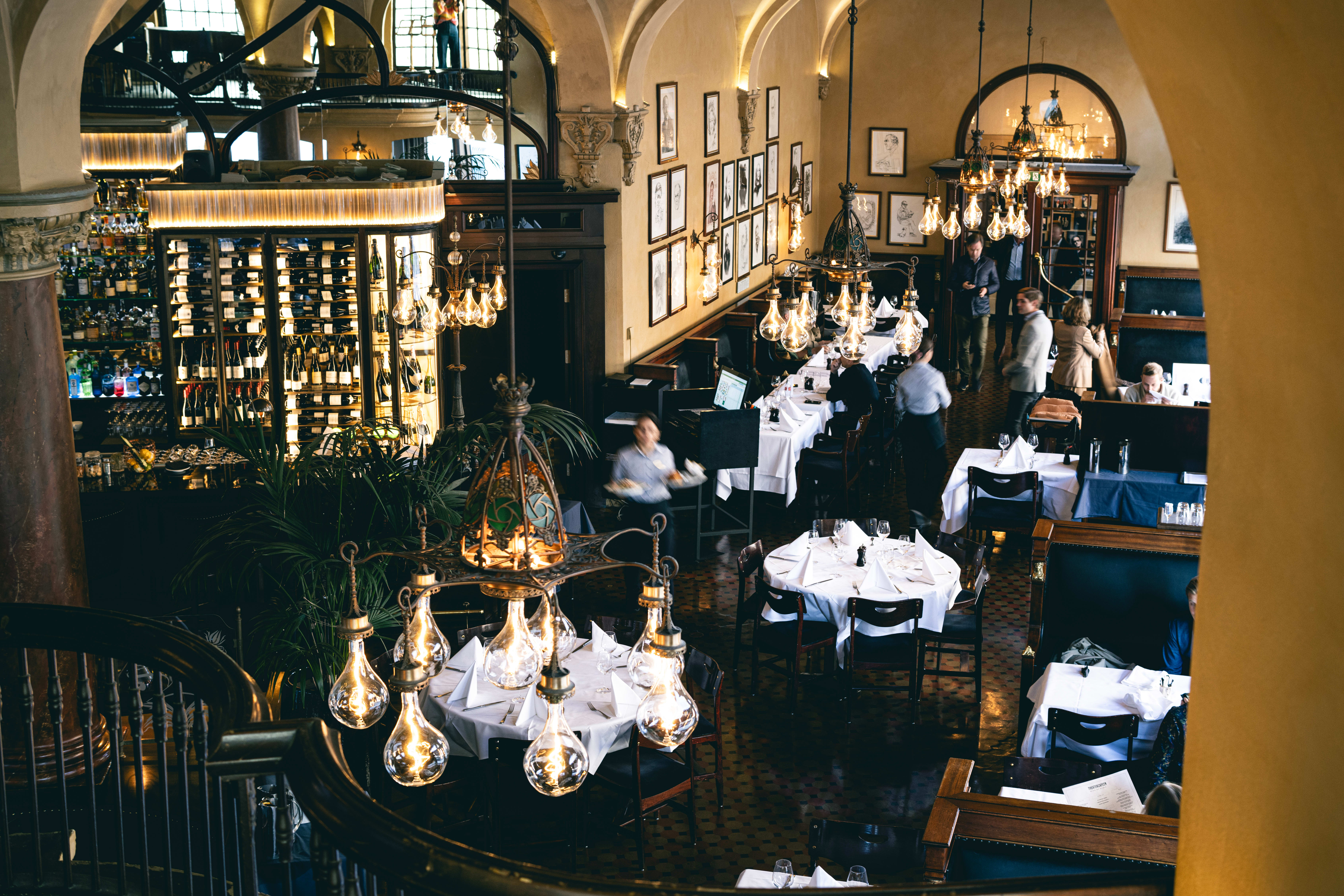 Lysekroner under det hvelvede taket, hvite duker og mørke tremøbler. Atmosfæren får oss umiddelbart i godt humør. Lokalet har historisk sus, men prøver også å si: «Her kan du feste». For eksempel med et fremtredende champagneskap fylt med kjente etiketter. På menyen finnes også en haug med cocktails, samt vodka og kaviar.
