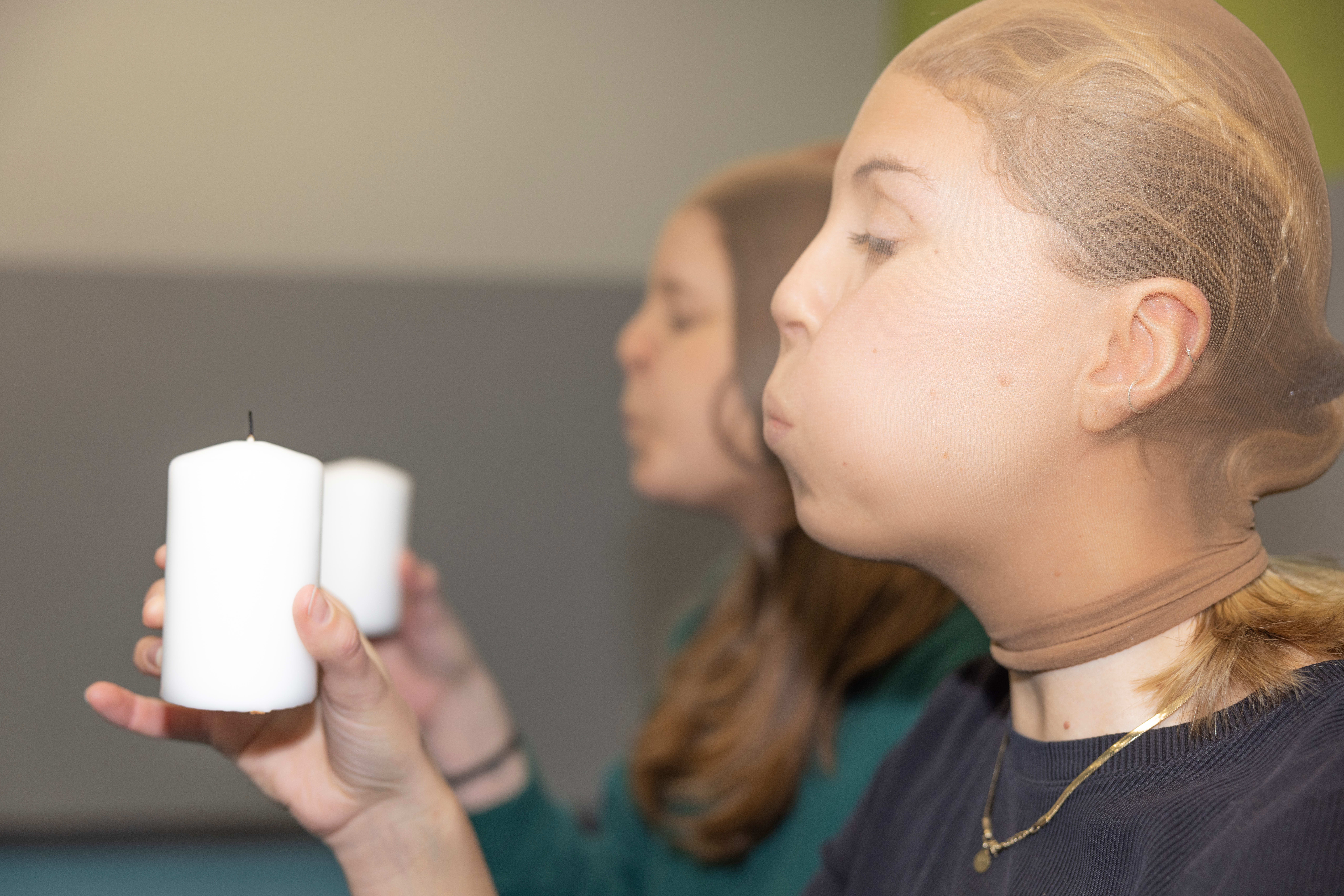 Blås ut et lys med en strømpebukse på hodet.