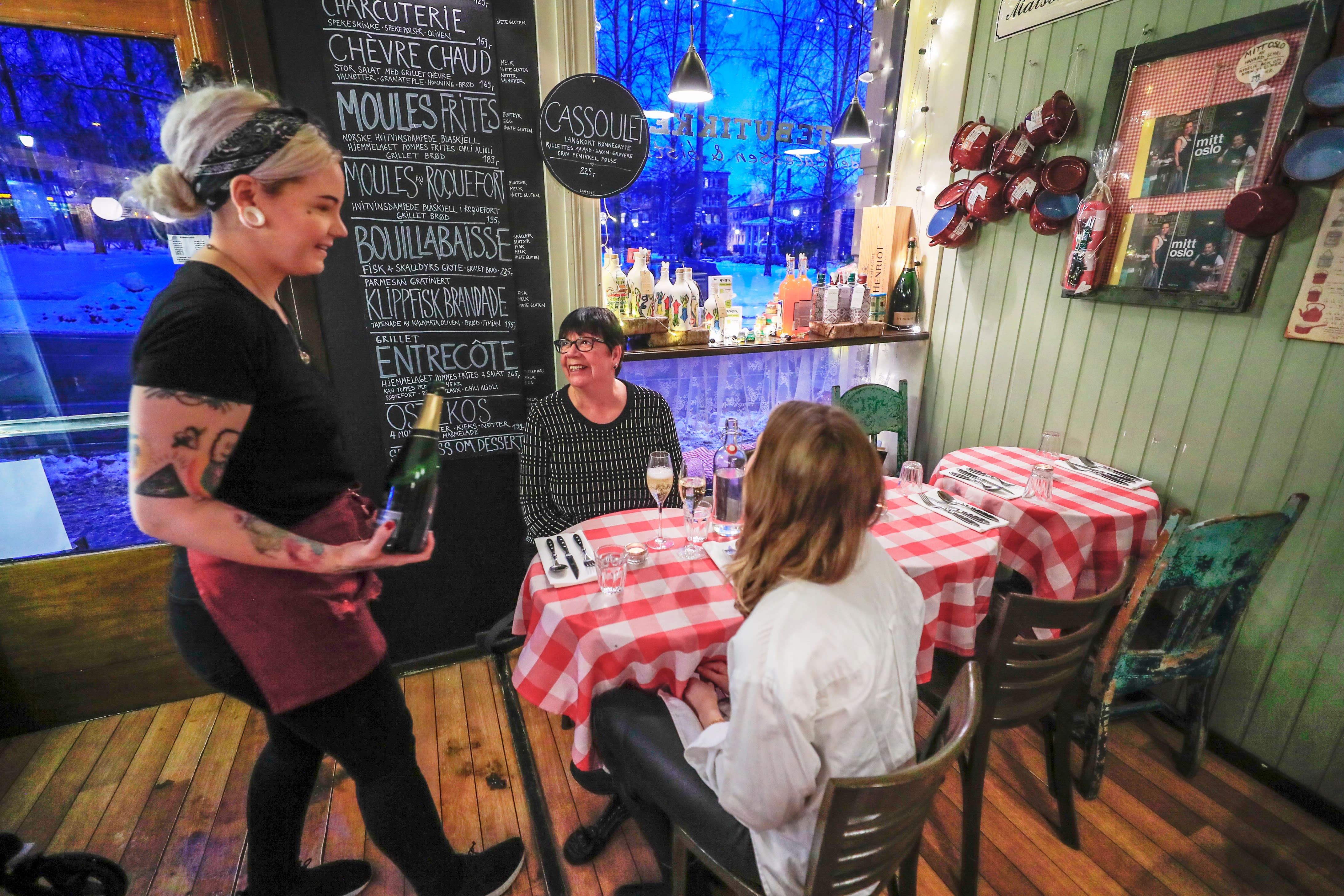 – Det er bare et par bord innerst som er ledige, sier Bordvenninnen, som også skryter av servitørens vinvalg til våre retter.