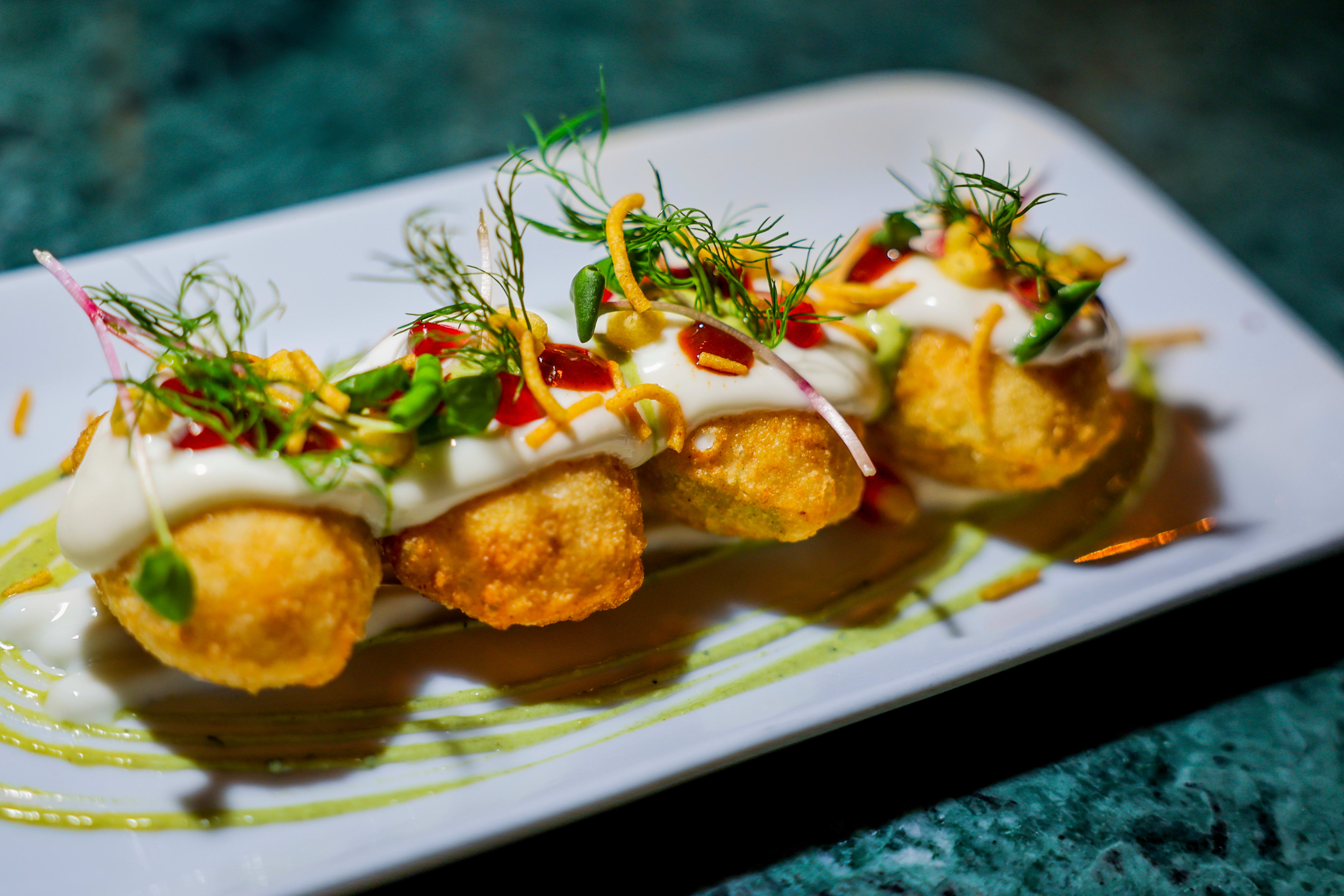 1. For mye mat. Den store menyen som stedet promoterer, består altså av hele ni (!) retter. Med unntak av appetittvekkeren, som er en fritert potetball (dhai puri), er porsjonene altfor store. Forrettene kommer alle med en mektig saus samt store stykker kjøtt eller sjømat. Vi får bare tatt en smak av hovedrettene før vi er så mette at resten havner i en doggybag. Man skal helst føle seg vel etter et måltid, ikke klar til å legges inn.