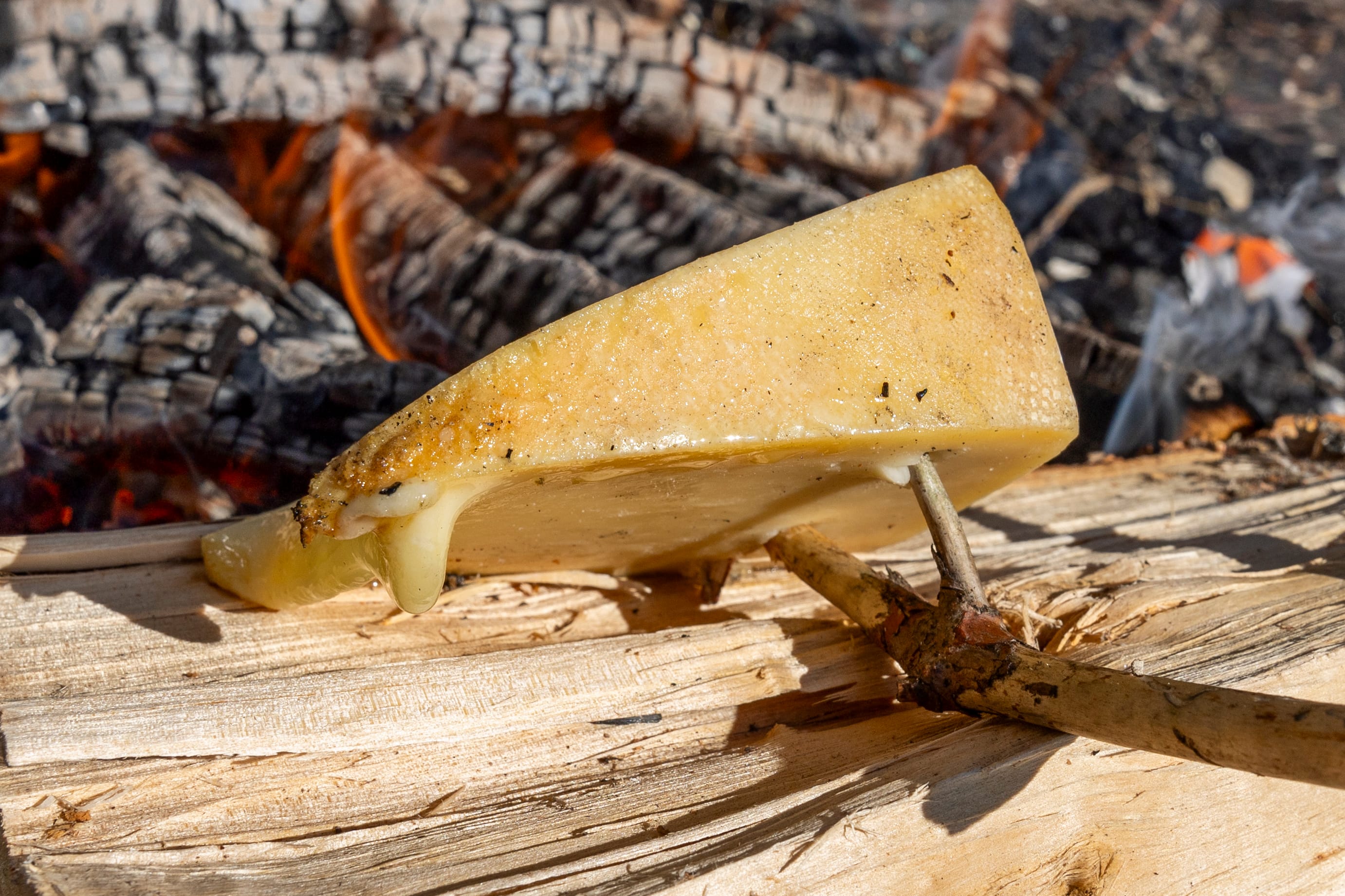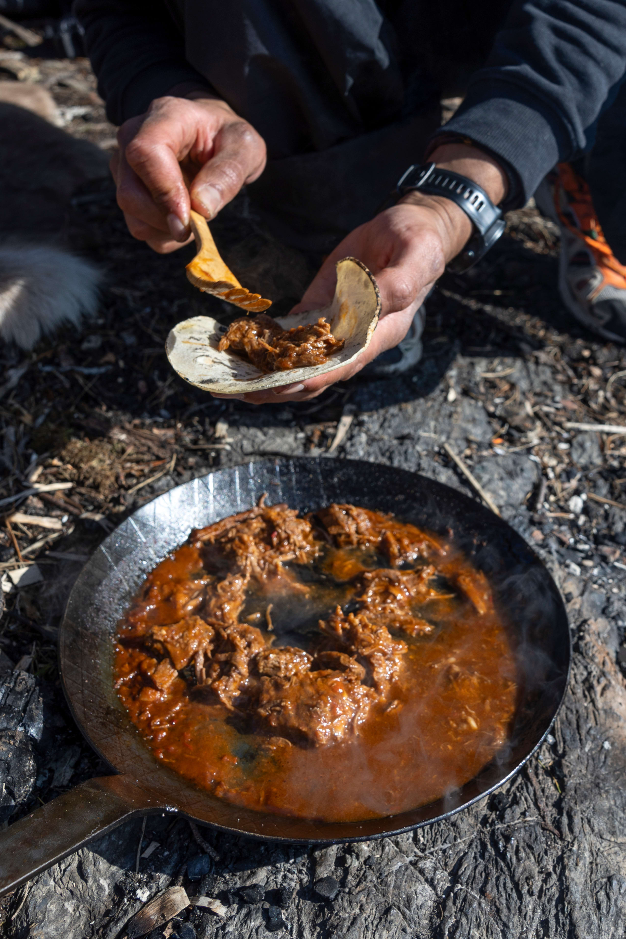 Mens kjøttet varmes i pannen, smelter osten i utkanten av bålet. Lefsen får varme seg på vedkubben i ti sekunder, og så schmakkes alt sammen på 1–2–3.