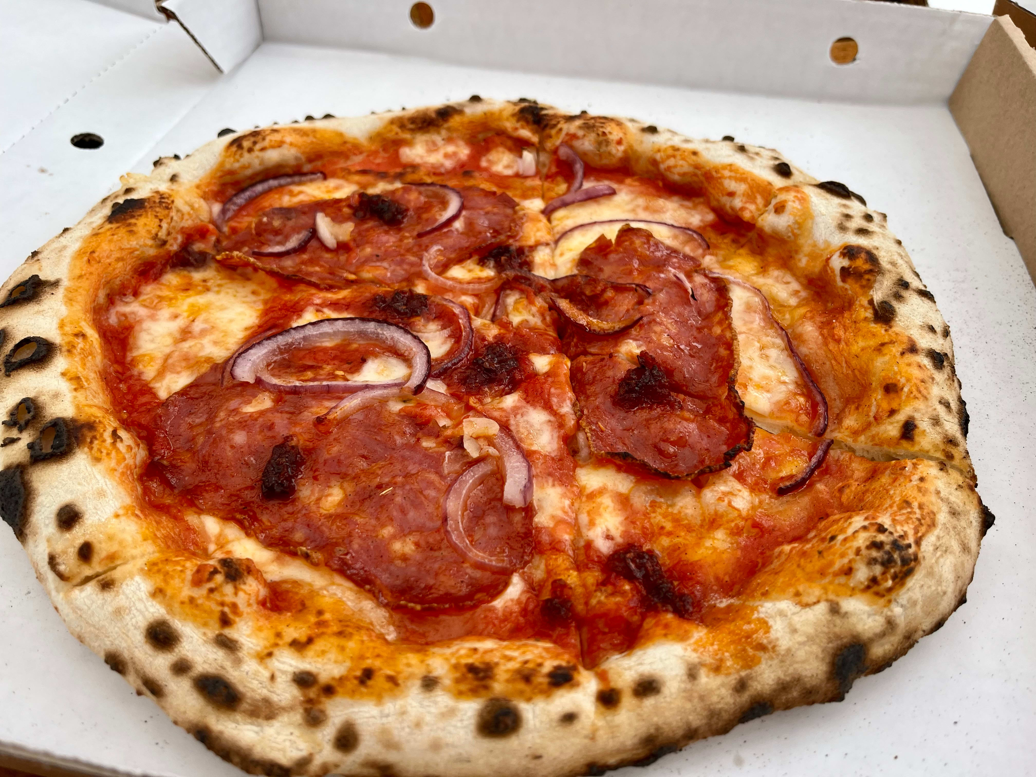 Ndjuaen på diavola-pizzaen har godt sting og er rund på smak. Det er raust med italiensk salami, og pølsen er blitt sprø i kantene – helt som den skal. Det eneste vi har å utsette på diavolaen er de ujevne løkskivene. De tre gründerne burde investert i en mandolin.