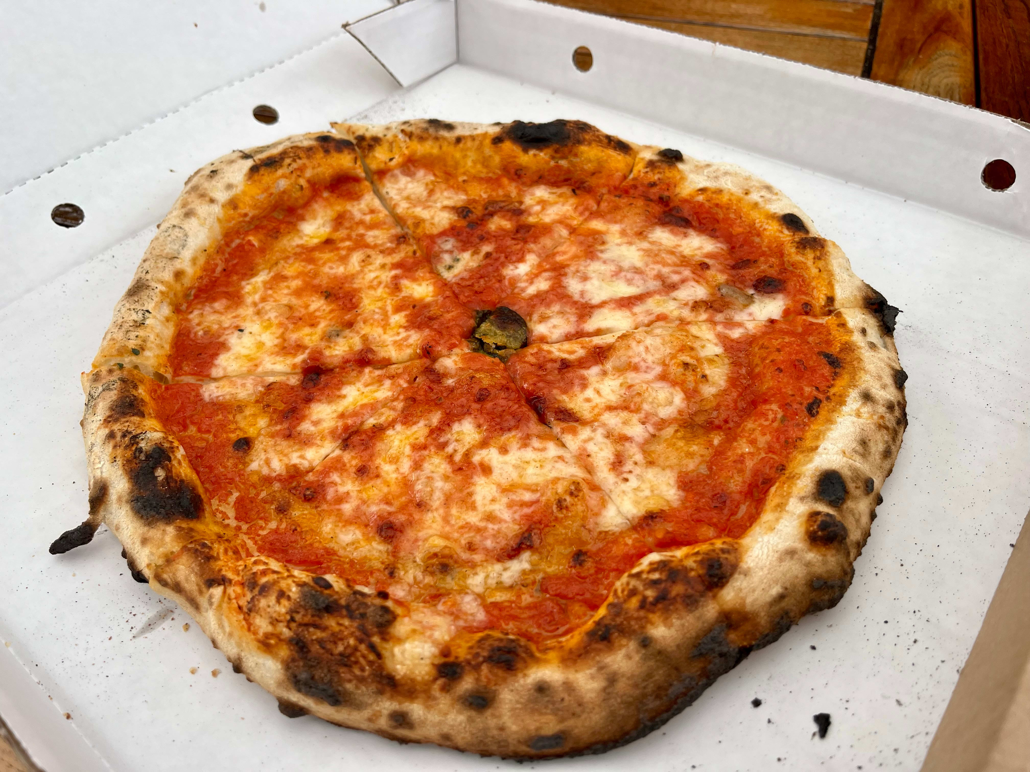 Margherita er alltid en god anledning for å sjekke det tekniske på pizzaer, de rene smakene. Tomatsausen er litt tam. Litt mer salt og sødme hadde gjort seg. Det er en fin mengde ost på, den er god på smak. Her går mange i fellen og hiver på for mye.