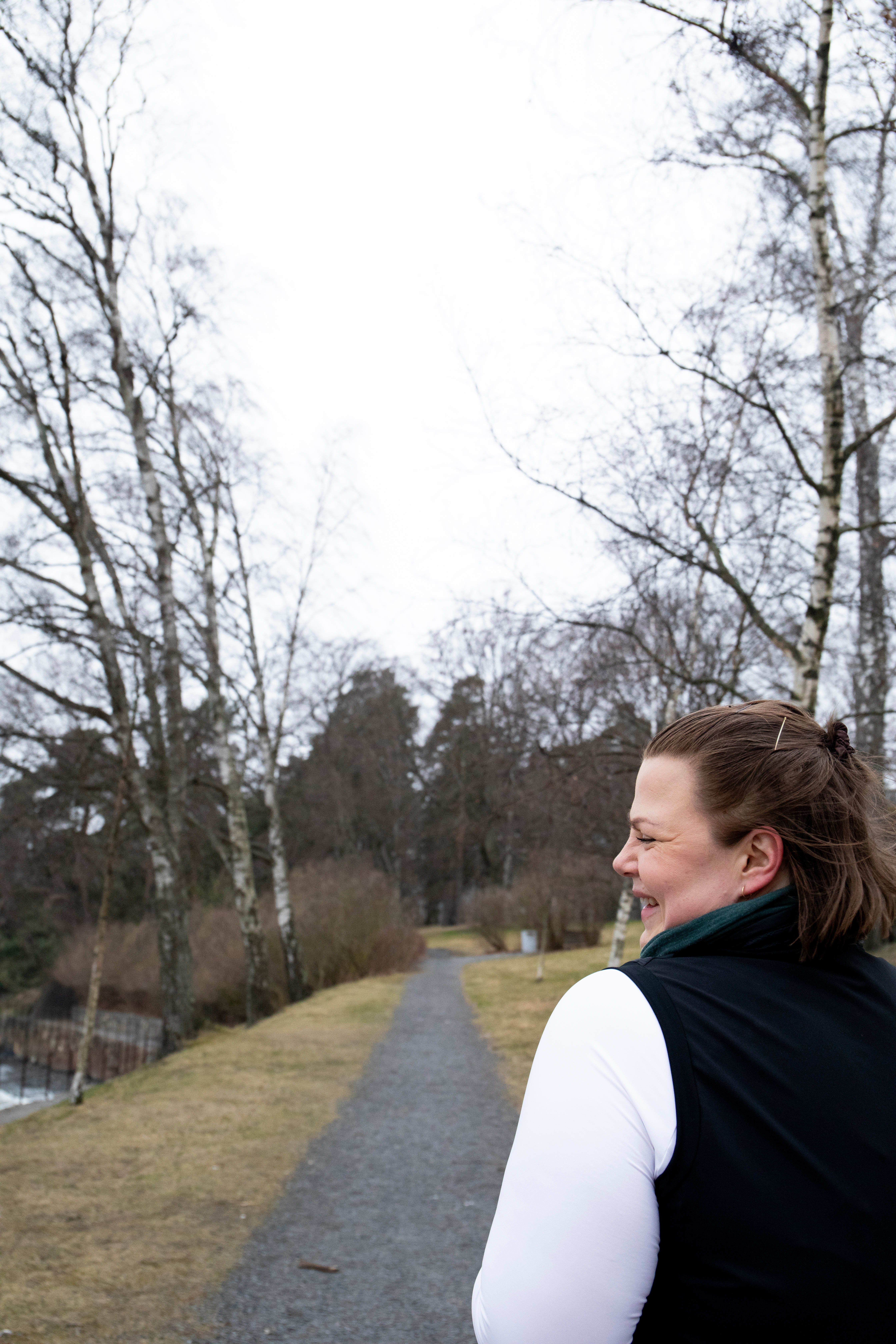 Ingunn Grytnes Kristensen (34) må stoppe noen sekunder i Vækerøparken på Lysaker. Kontrasten blir rett og slett litt overveldende.