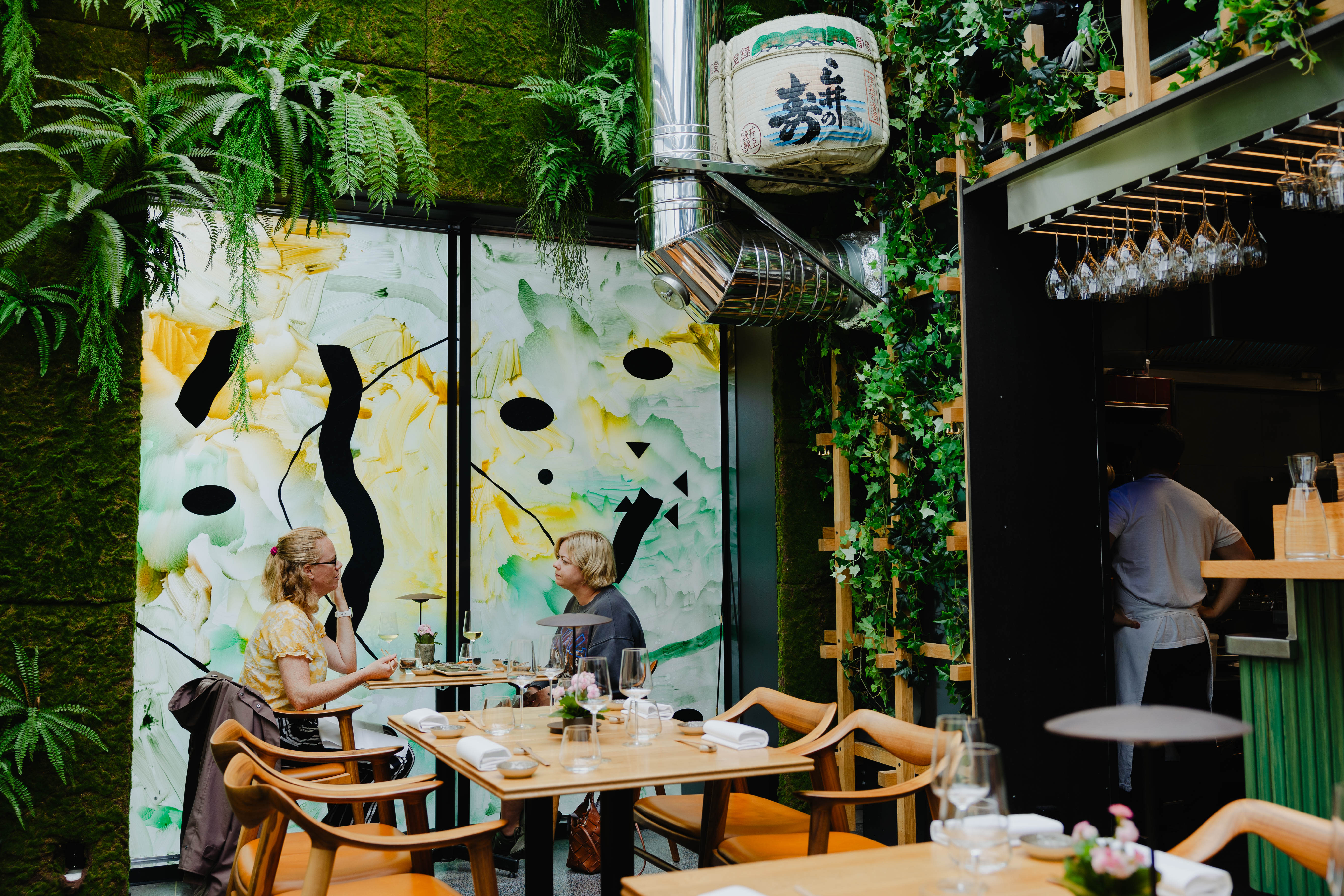 Vi har tatt banen til Røa, tuslet opp noen trapper. Nå står vi ved inngangen til den japanske restauranten Black Napkins. Inne er det grønt, høyt under taket og moderne. Bak baren står kokken og jobber.