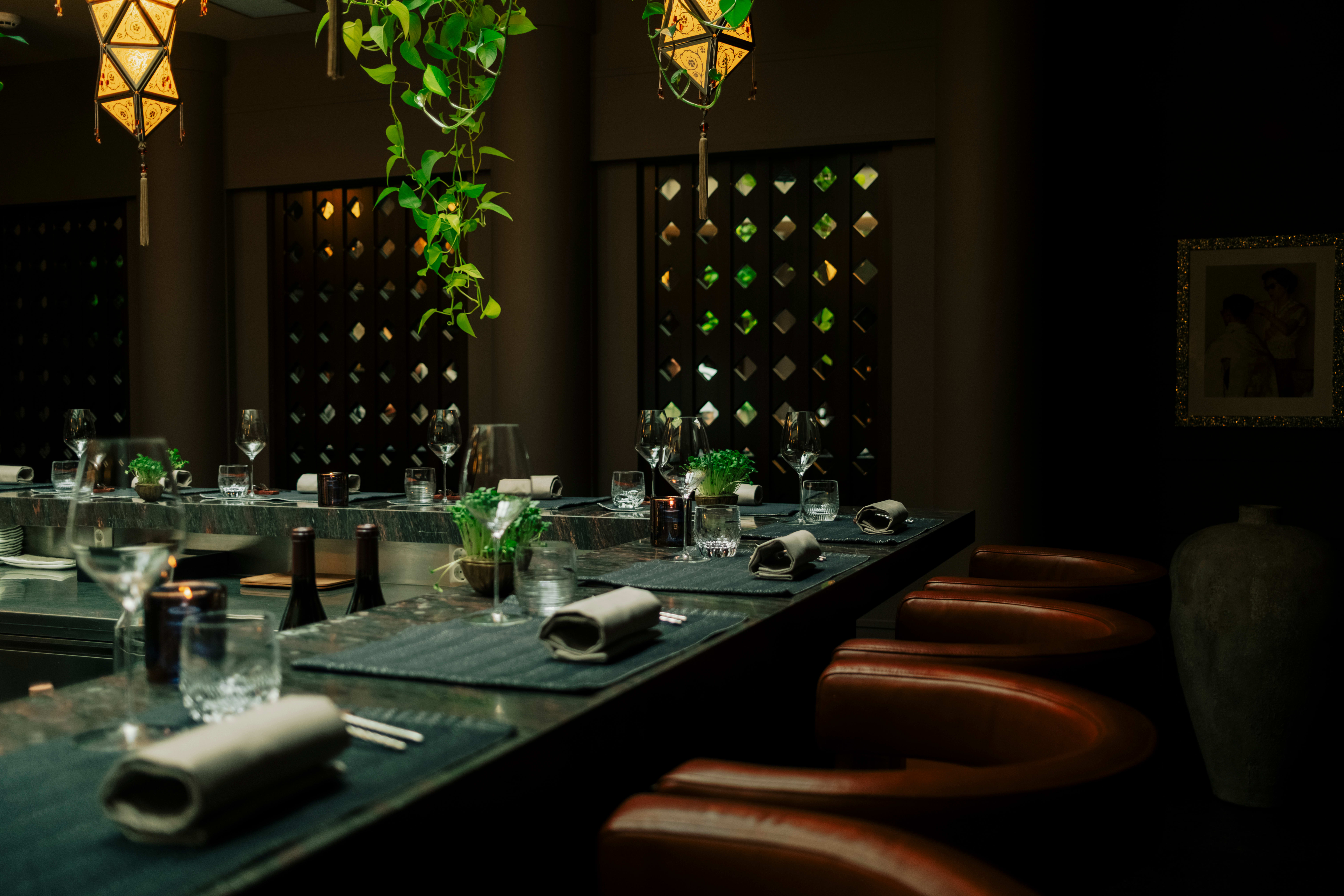 Deretter åpnes dørene inn til neste rom. Her er lune, vakre lamper, grønne planter over en U-formet marmorbenk og 18 sitteplasser. Vel plassert i høye, lysebrune stoler, har vi oversikt over alt kokkene foretar seg. Steking, grilling og dandering av alle retter kan studeres nøye. Timingen og samhandlingen mellom de ulike kokkene er imponerende. Her får du innblikk i hvor mye jobb som ligger bak hver enkelt servering.