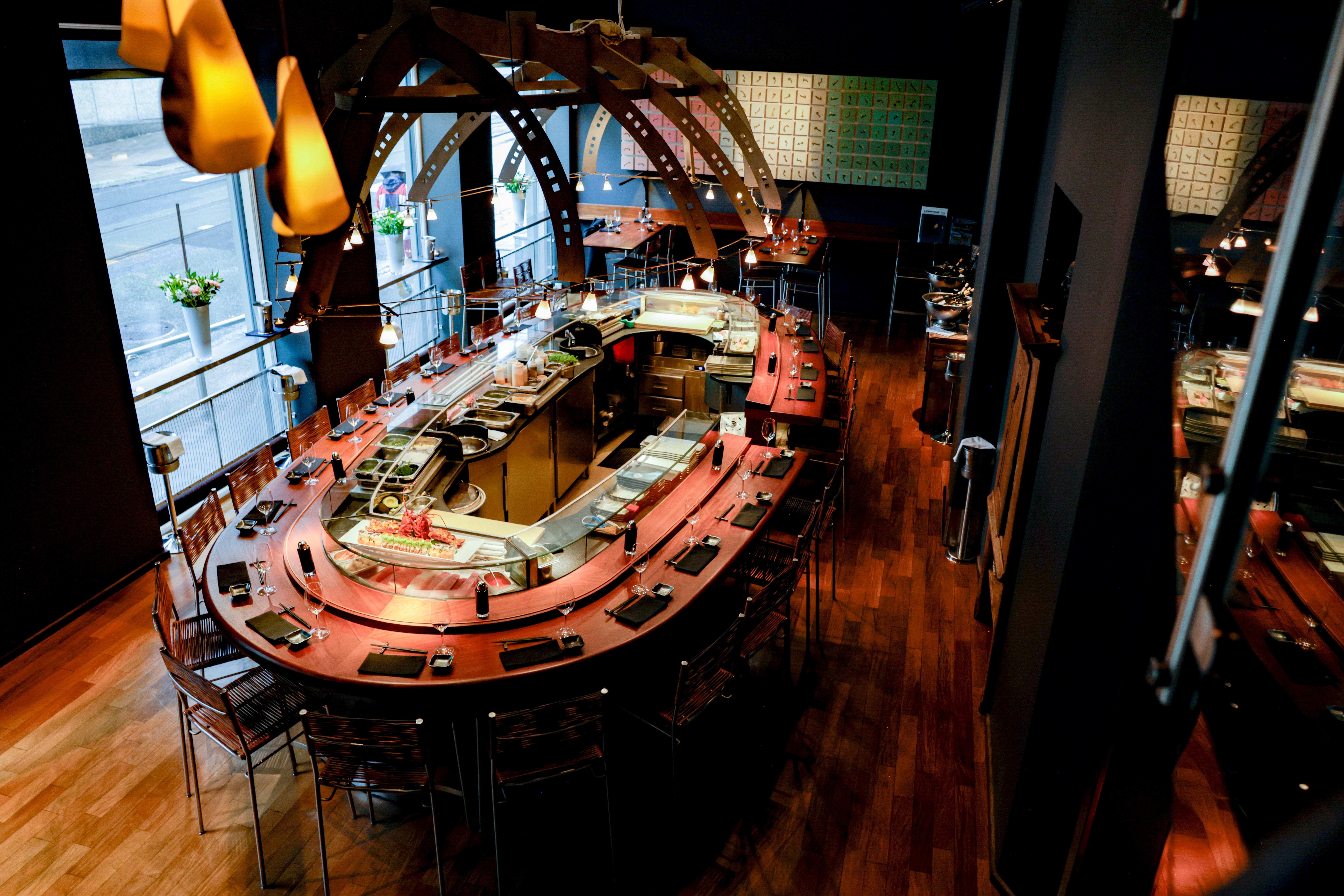 Noen bilder liver opp rommet, men det føles likevel innestengt her. Hvis du ikke får plass i sushibaren, er bordene rundt i lokalet ellers fine. Trebordene har smarte løsninger med en topp på midten hvor maten blir plassert.