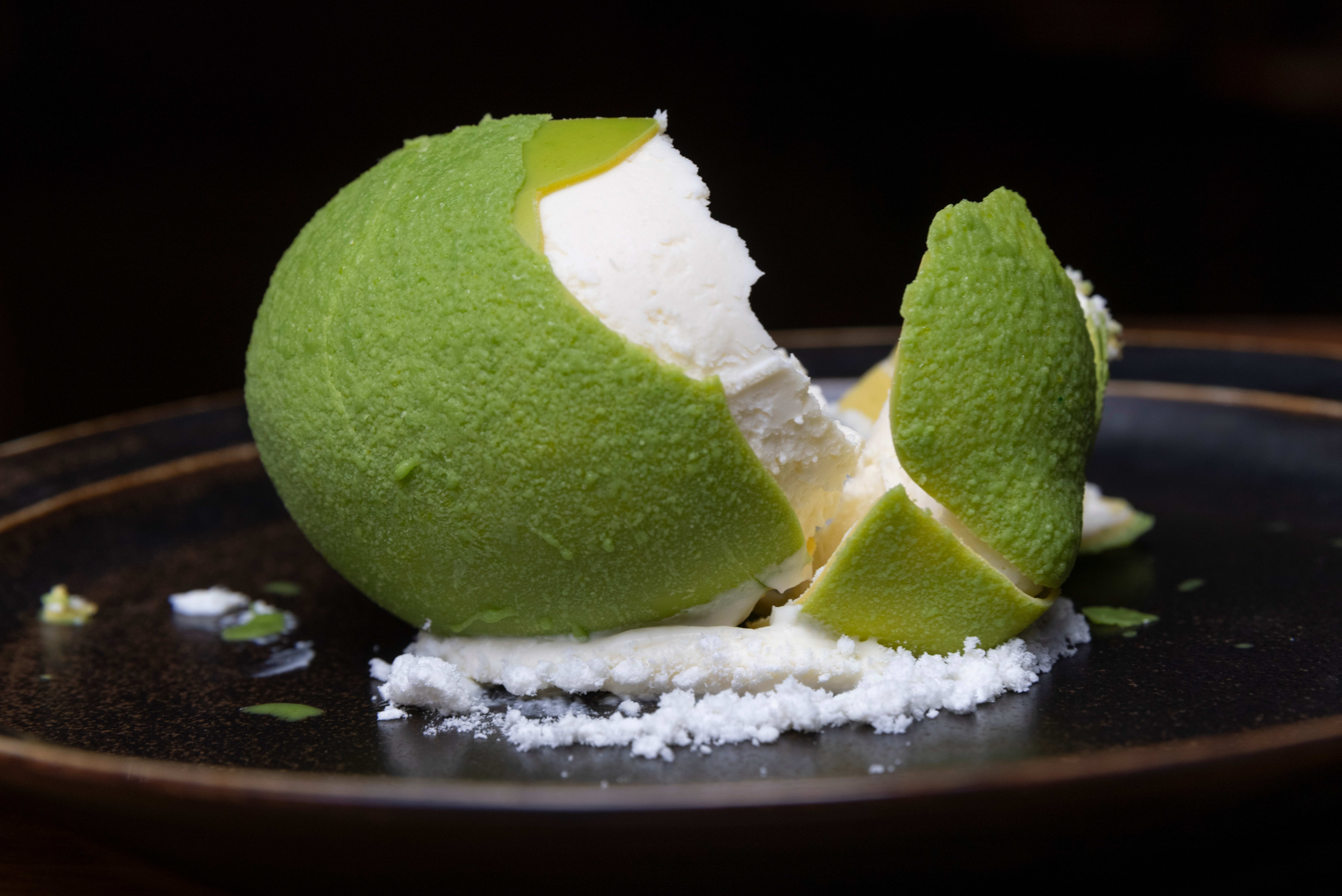 – Kakk den som et egg, sier servitøren. Men i motsetning til et egg, kan alt spises her. Skallet er egentlig en sjokolade, inni er det hvit sjokolademousse og limecurd. Det sprø skallet gir kontrast til den myke kremen, det er søtt, syrlig og veldig, veldig godt.
