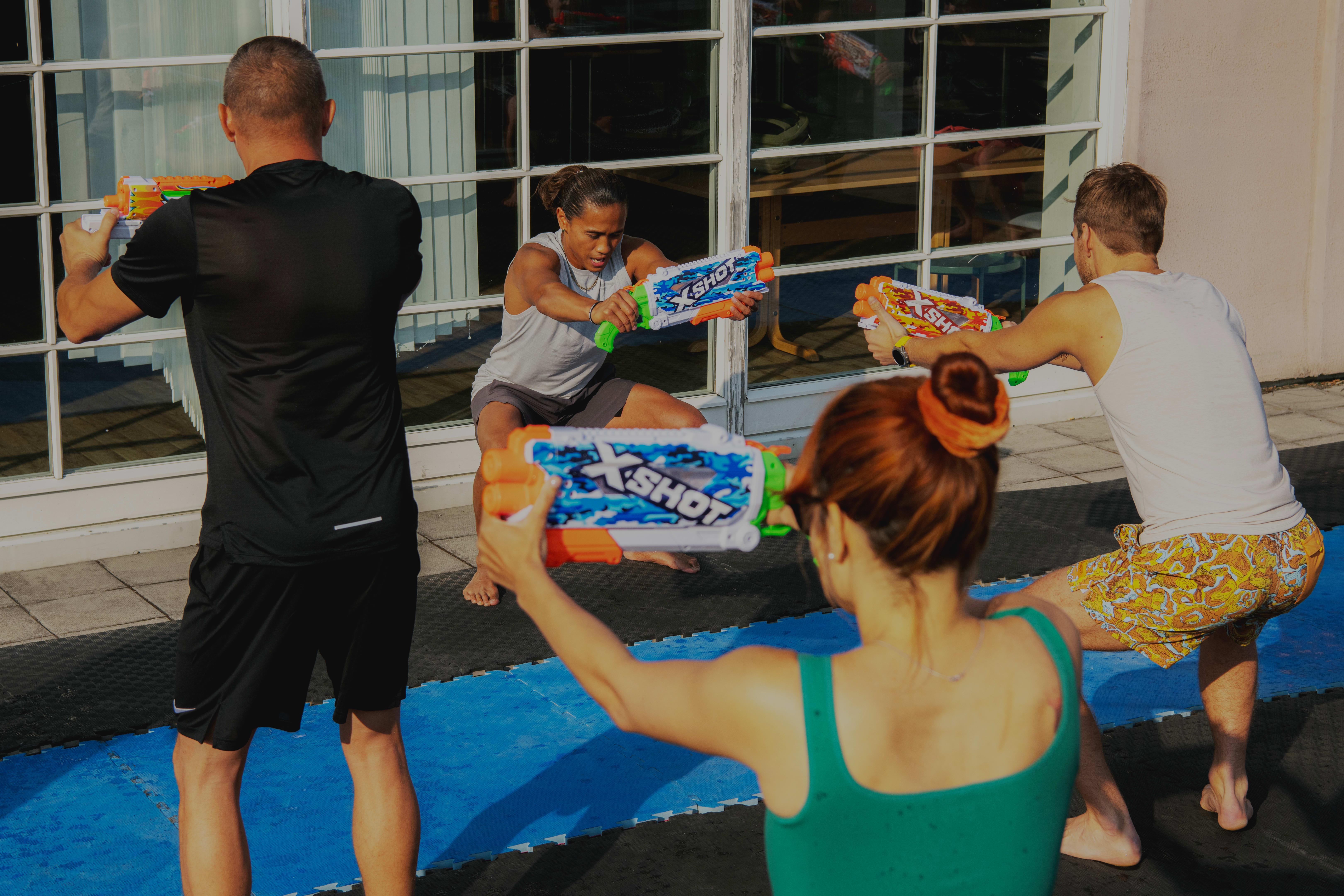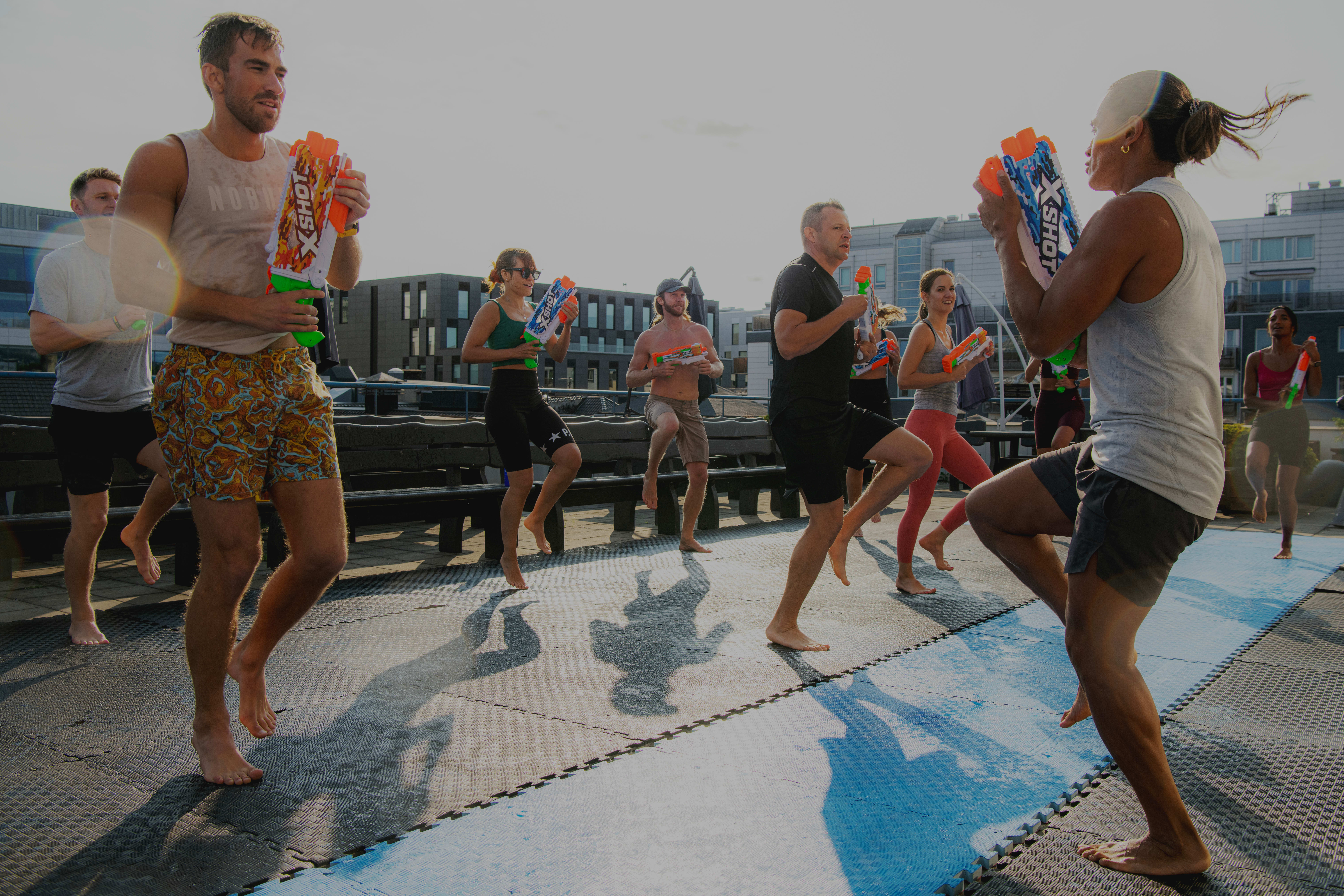 I sommer har de hatt en time på takterrassen der ulike styrkeøvelser kombineres med vannballonger og vannpistoler.