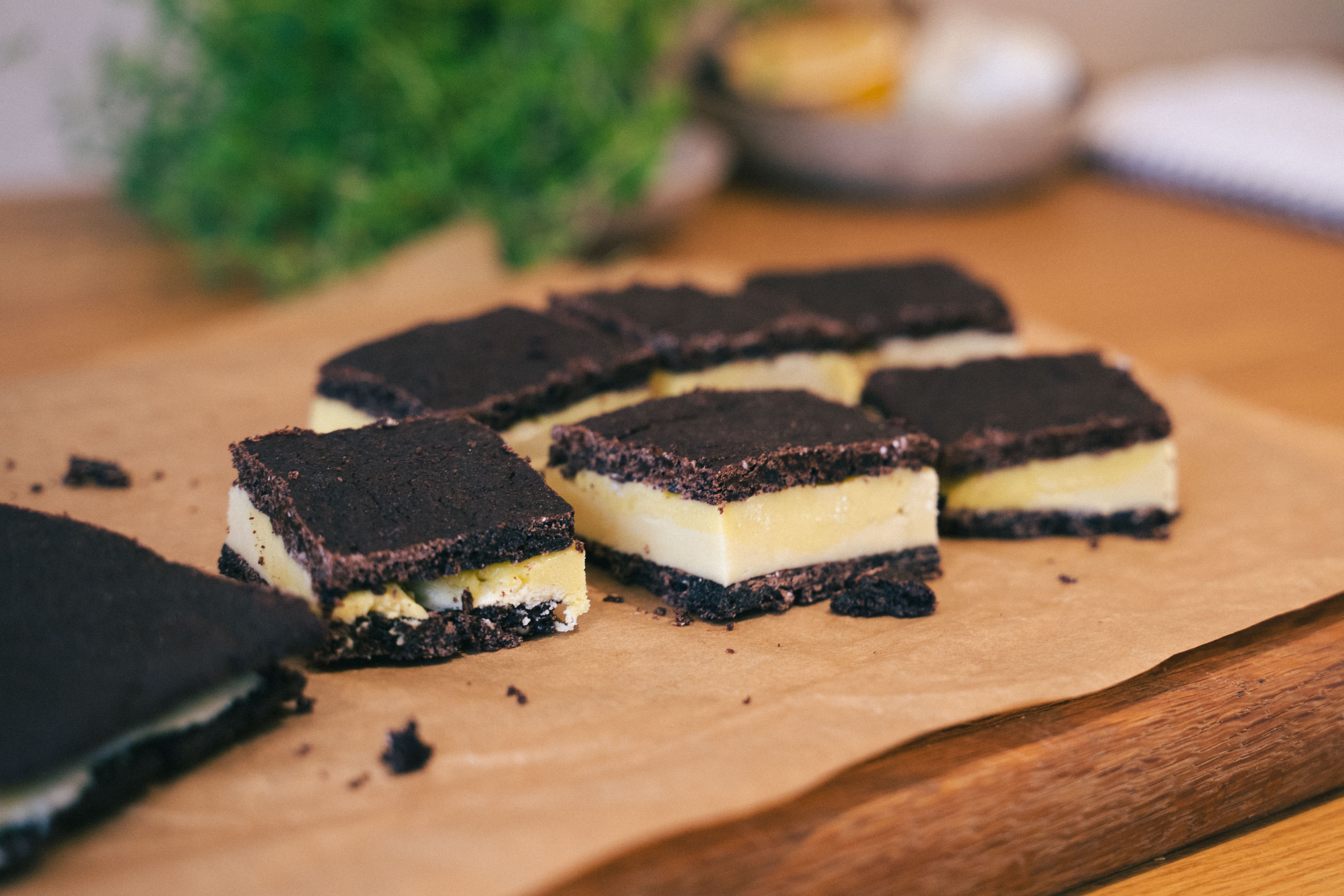 Legg den andre bunnen oppå, og putt i fryseren. Vent i minimum 4 timer. Skjær opp i passende biter og server!